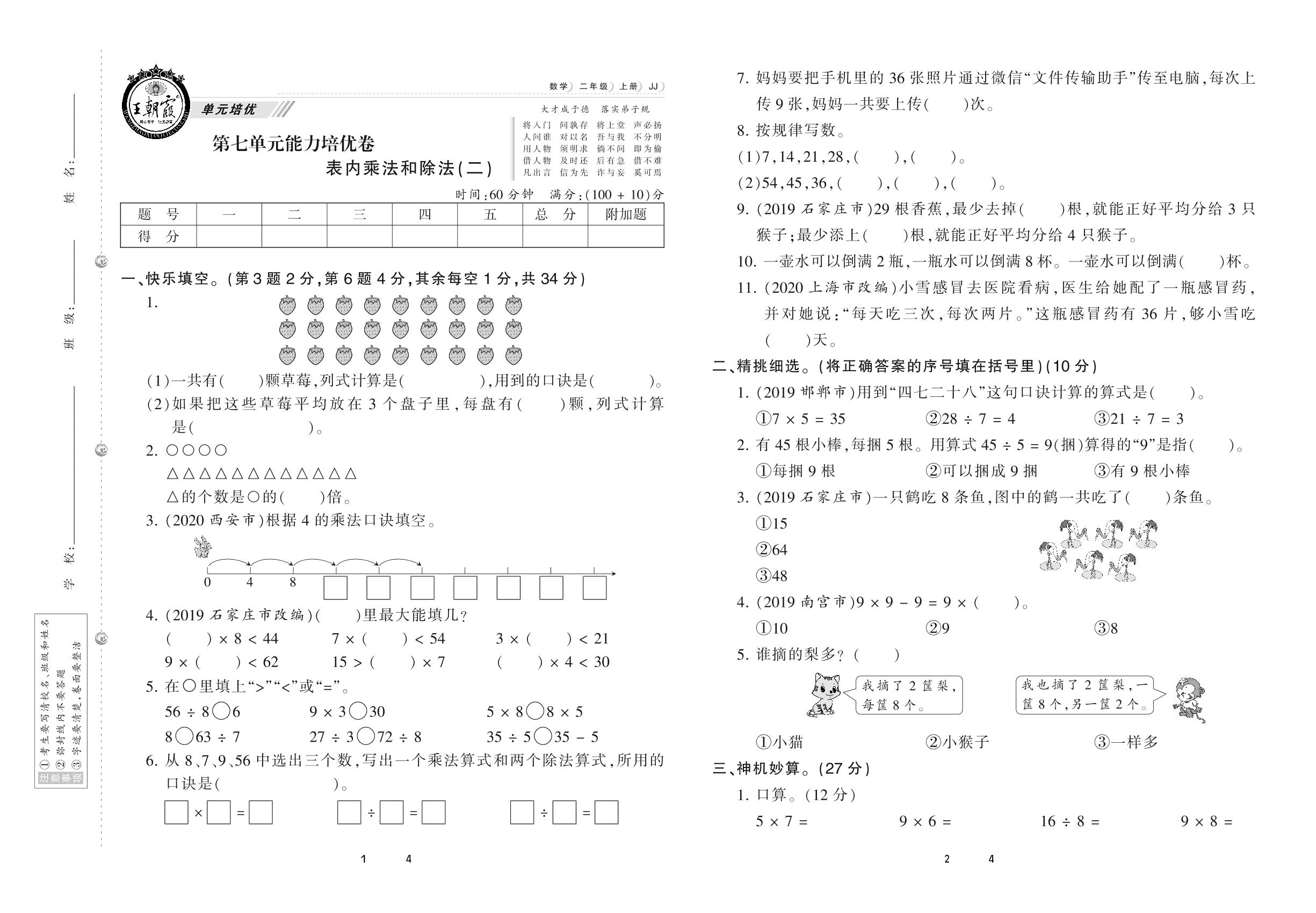 2020上册二年级数学冀教版 第七单元 能力培优卷