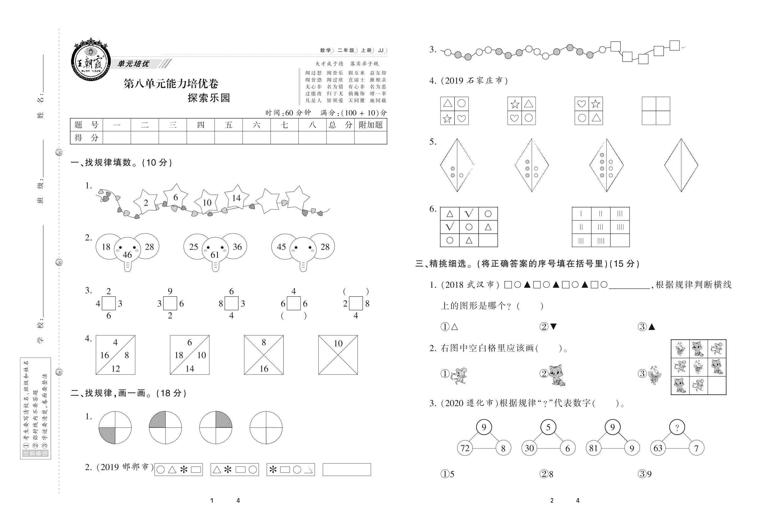 2020上册二年级数学冀教版 第八单元 能力培优卷