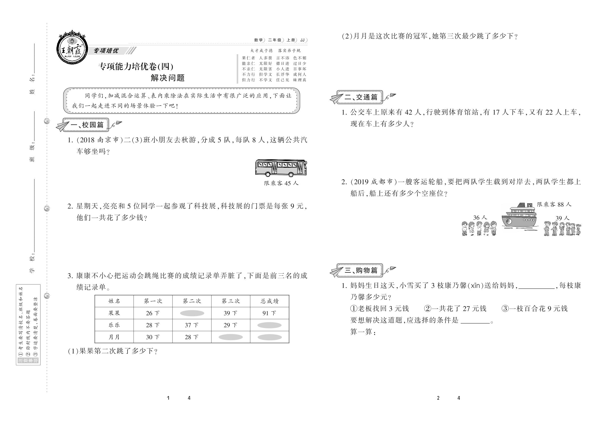2020上册二年级数学冀教版 专项能力培优卷(四) 解决问题