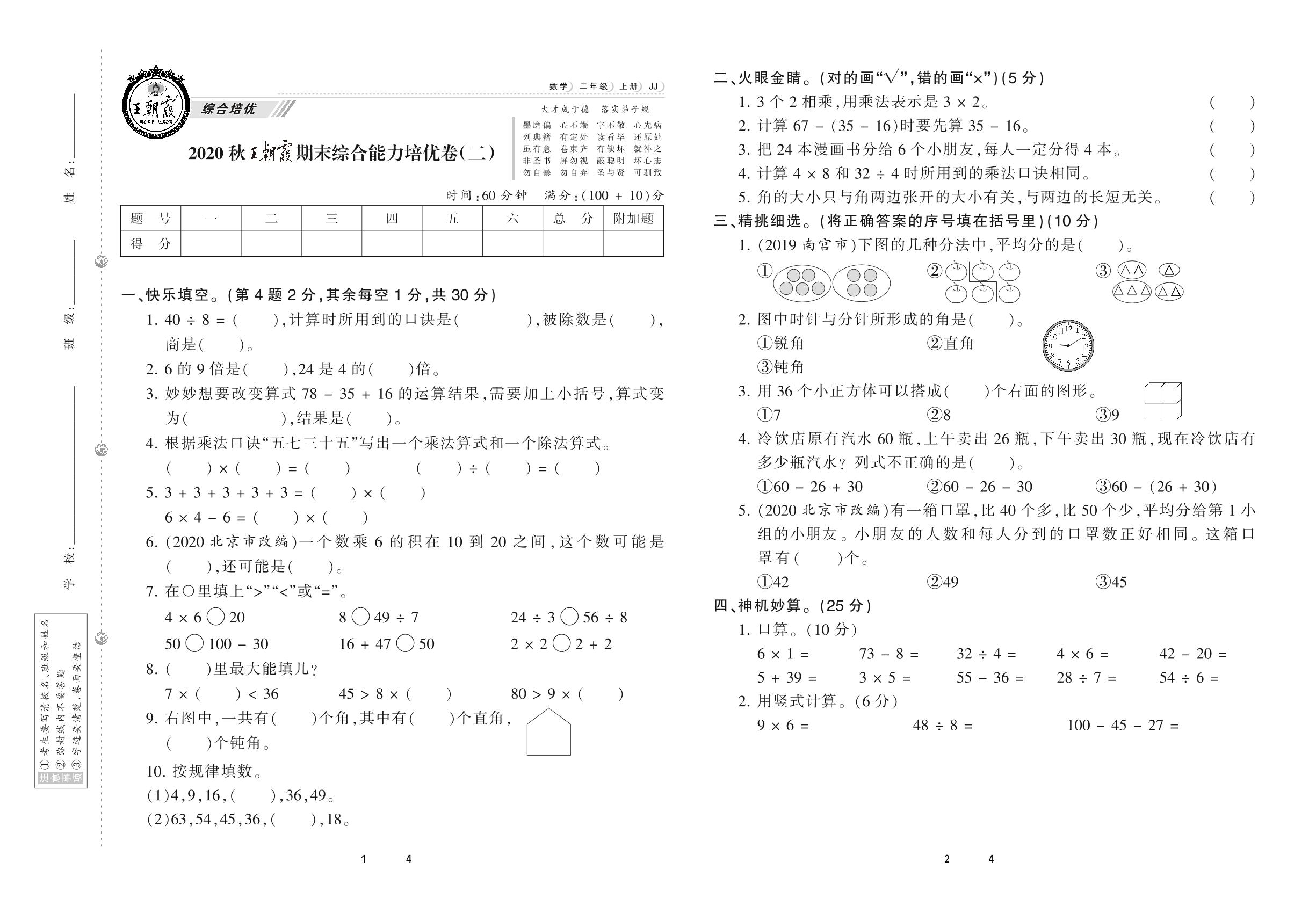 2020上册二年级数学冀教版 王朝霞期末综合能力培优卷(二)