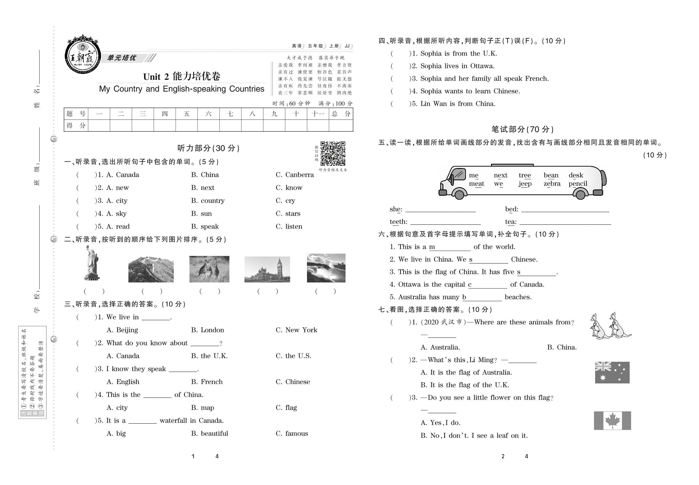 五年级英语冀教版上册单元卷