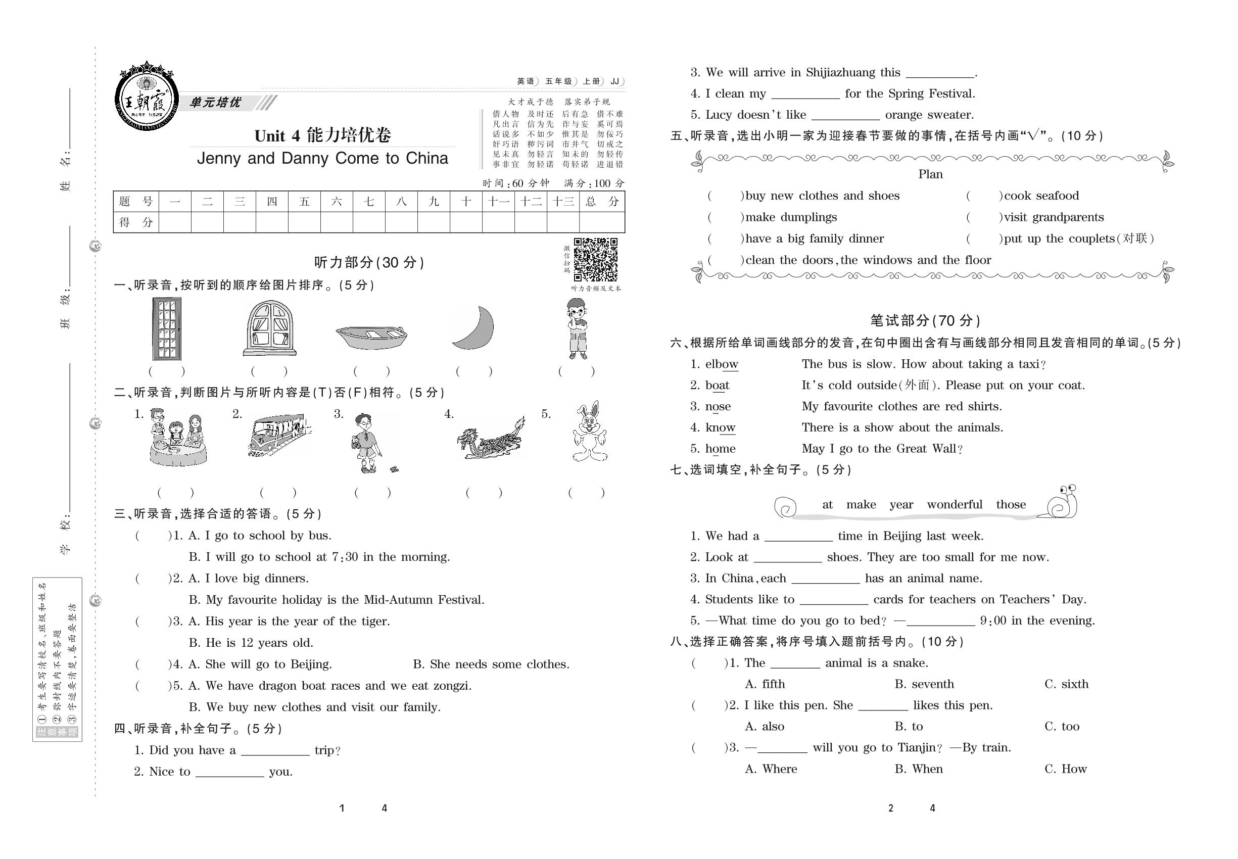 2020上册五年级英语冀教版 Unit 4 能力培优卷