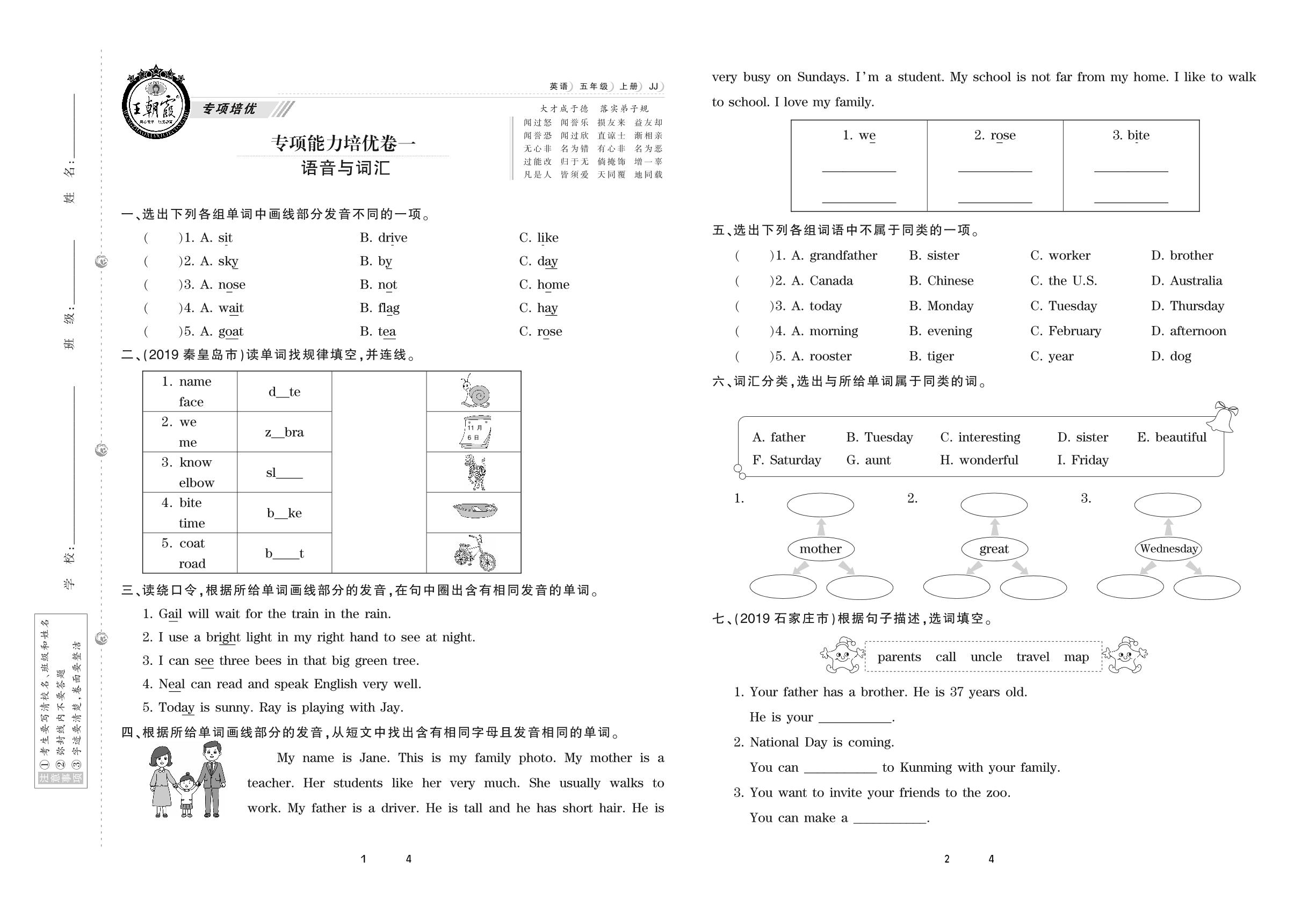 2020上册五年级英语冀教版 专项能力培优卷一 语音与词汇