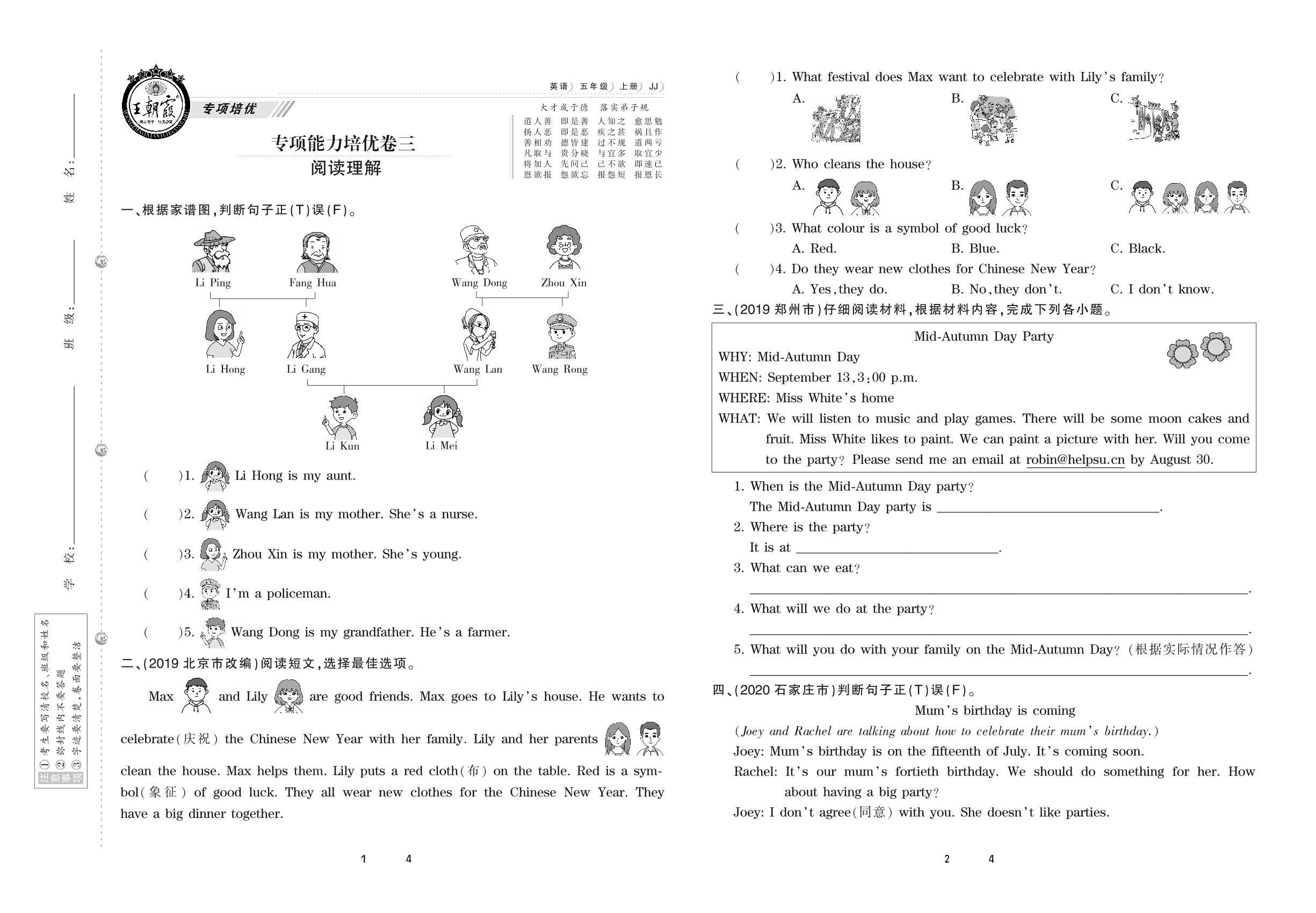 2020上册五年级英语冀教版 专项能力培优卷三 阅读理解