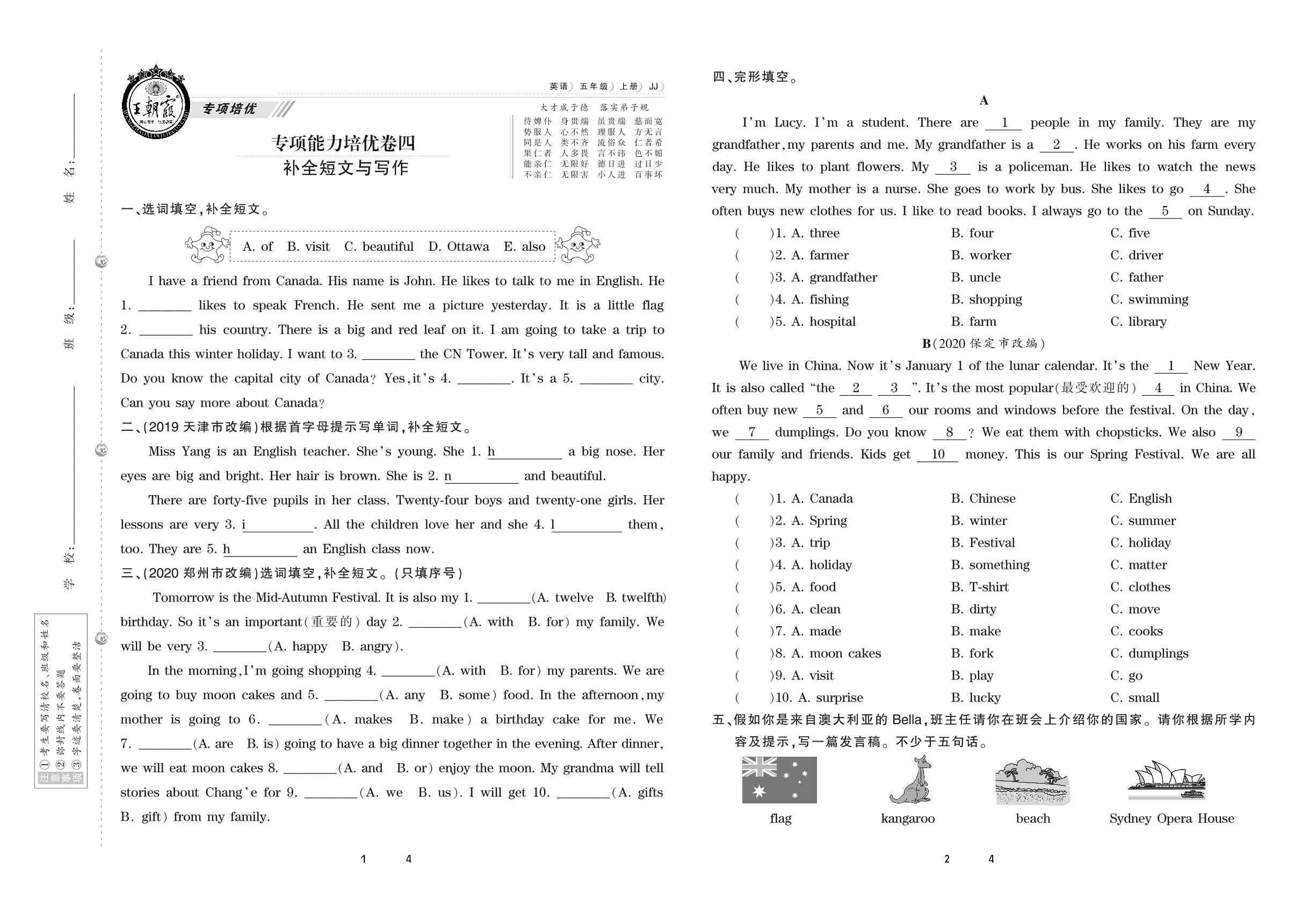 2020上册五年级英语冀教版 专项能力培优卷四 补全短文与写作
