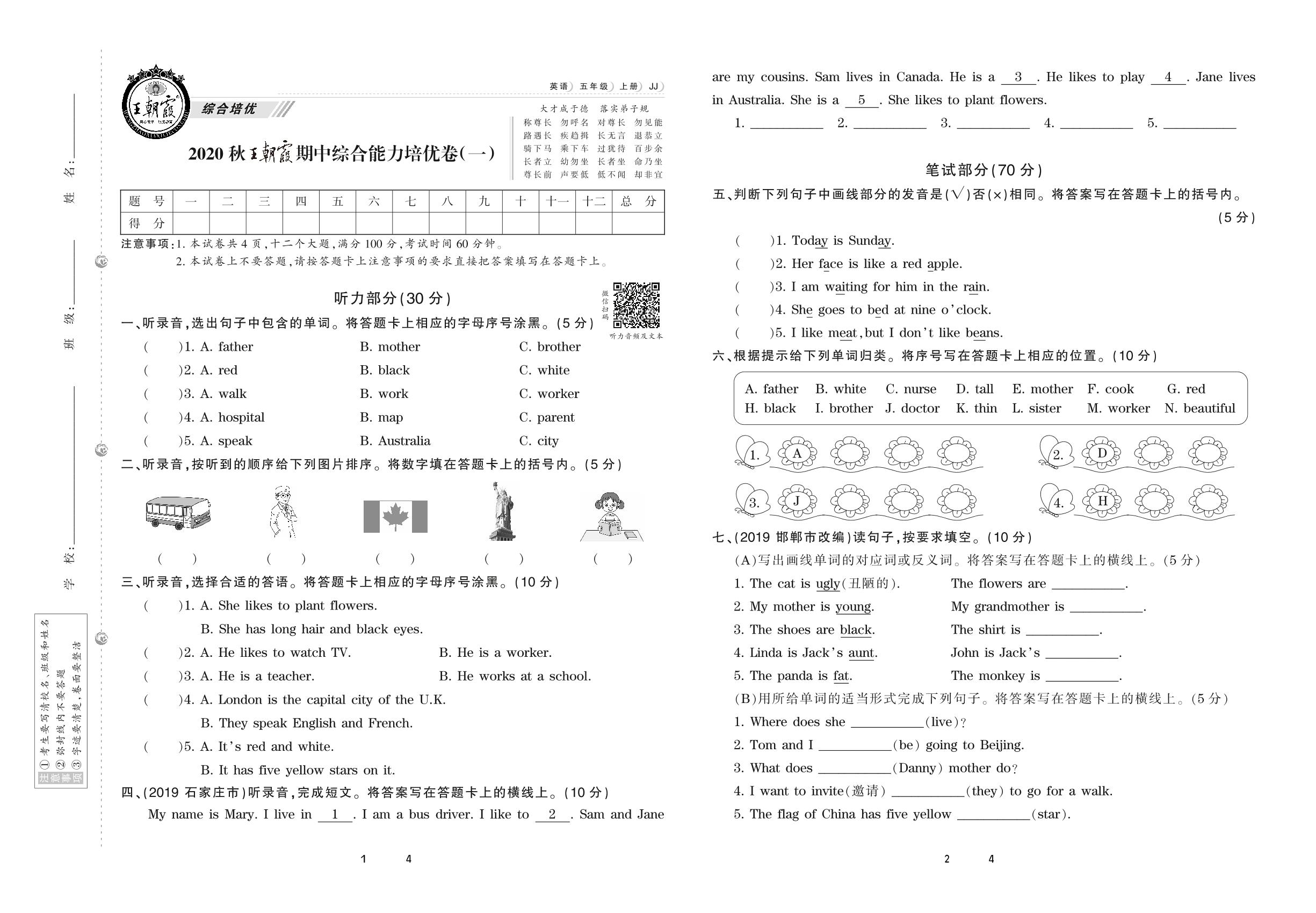 2020上册五年级英语冀教版 王朝霞期中综合能力培优卷(一)