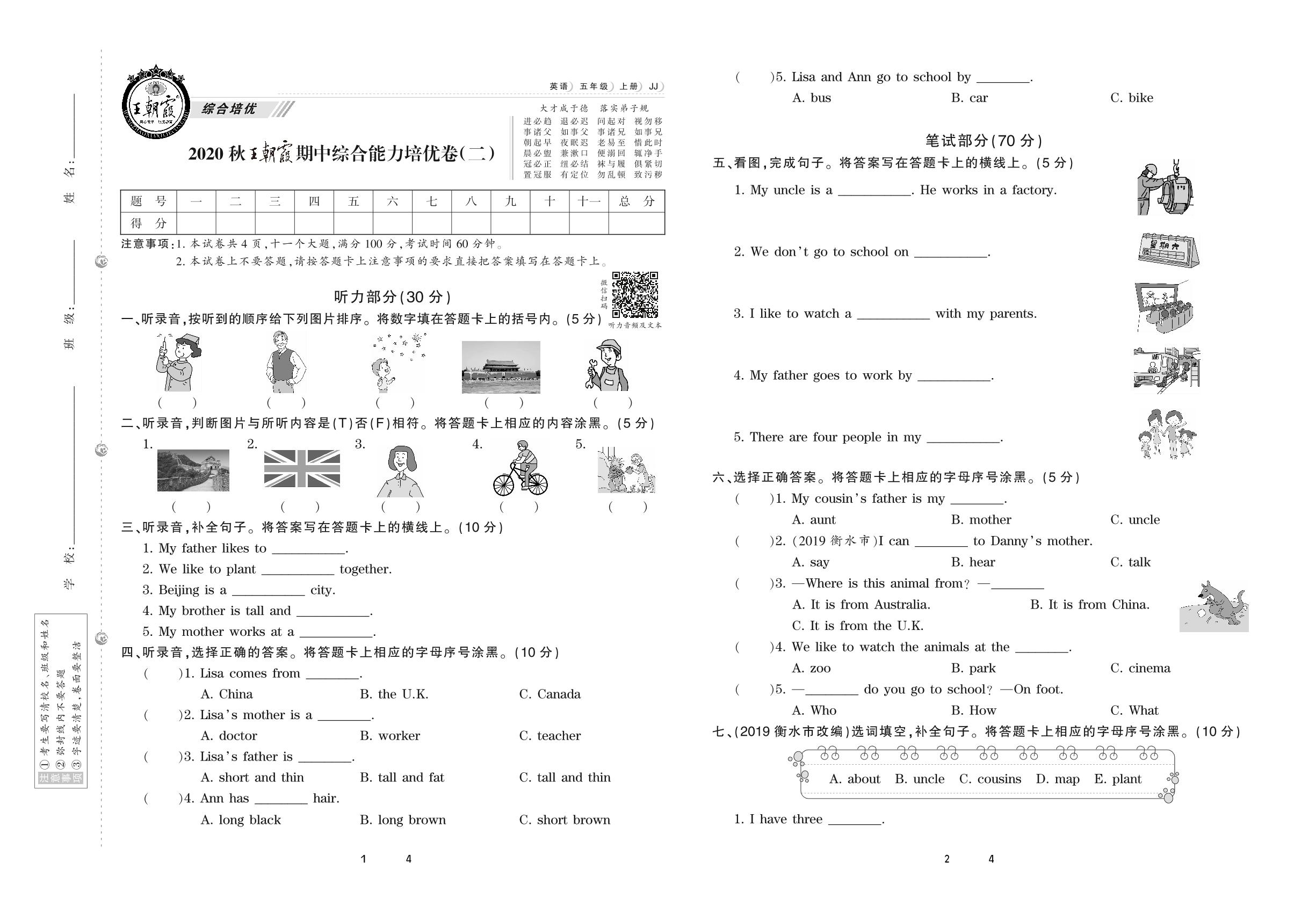 2020上册五年级英语冀教版 王朝霞期中综合能力培优卷(二)