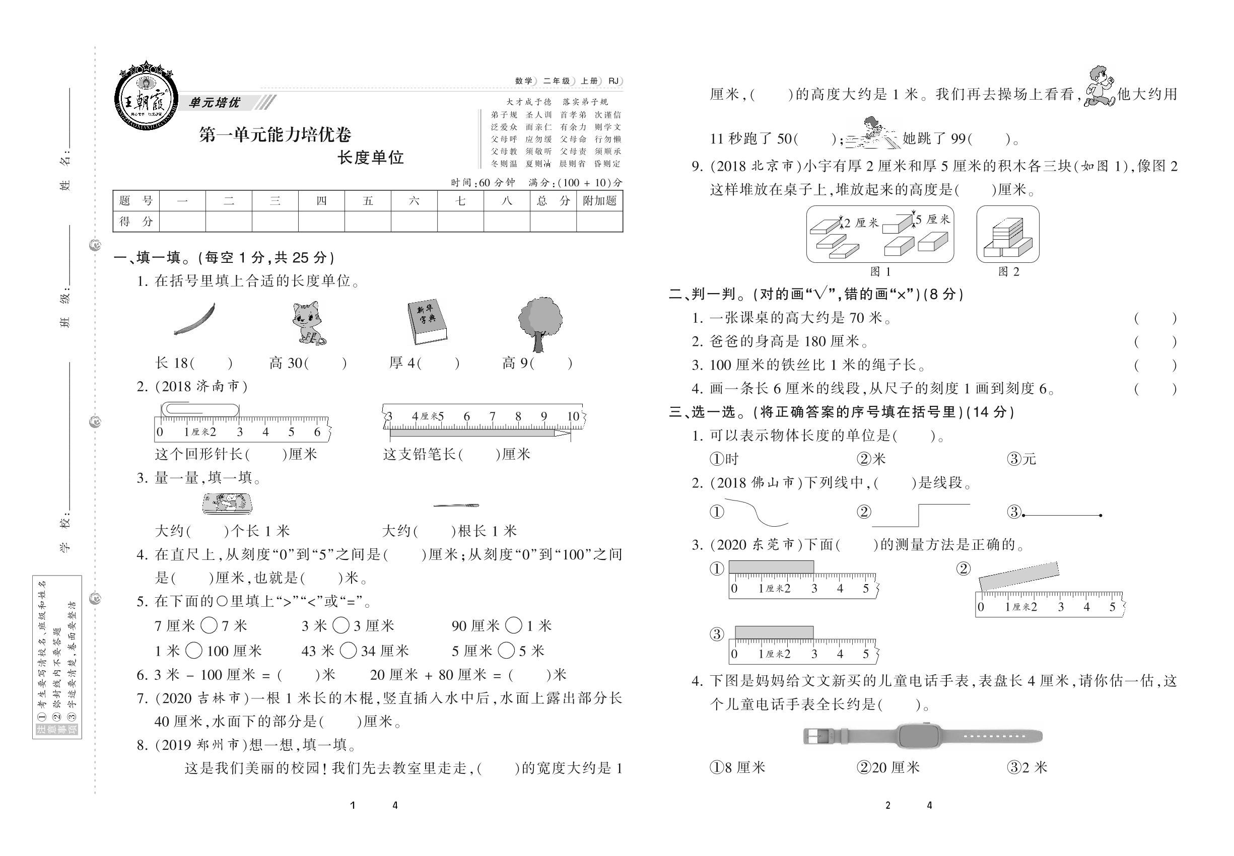 2020上册二年级数学人教版 第一单元 能力培优卷