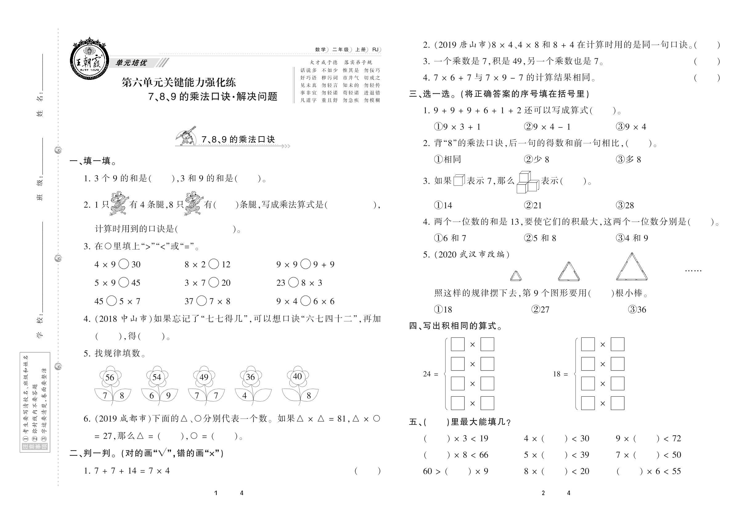2020上册二年级数学人教版 第六单元 关键能力强化练