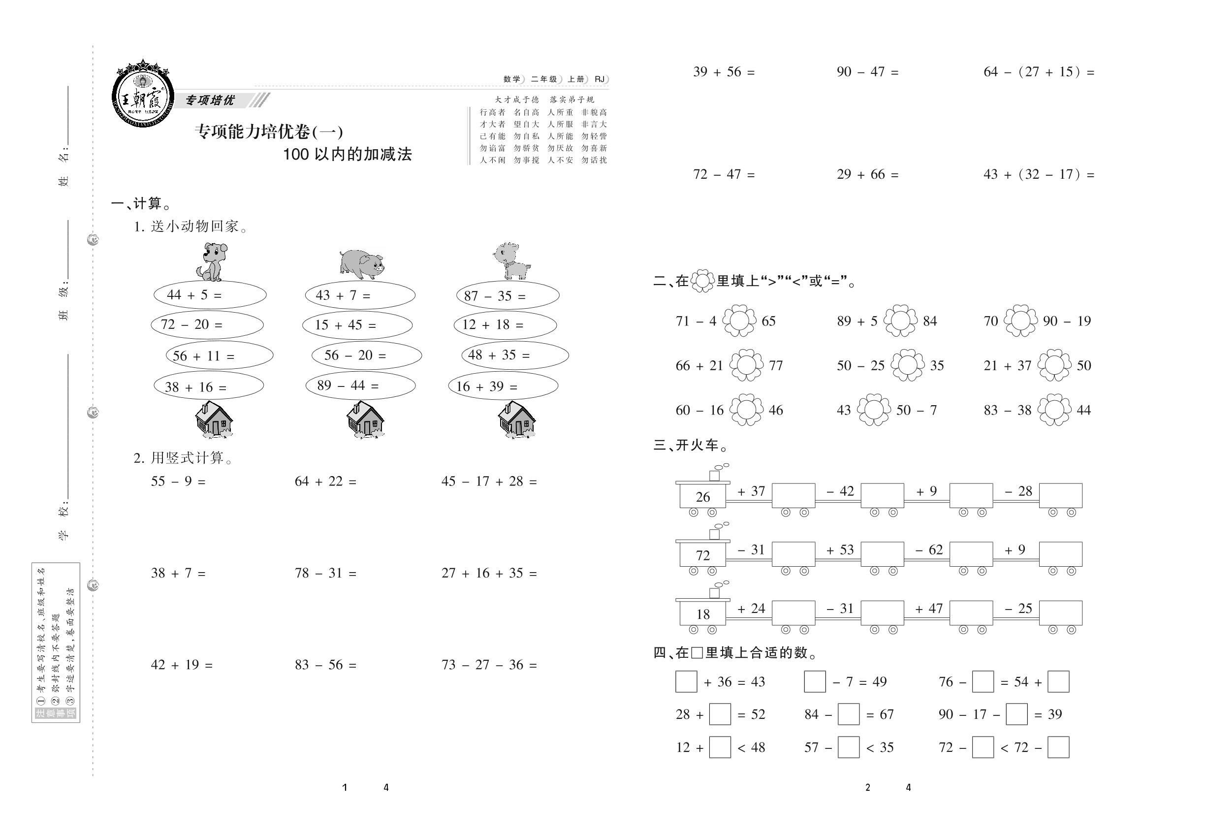 2020上册二年级数学人教版 专项能力培优卷(一) 100以内的加减法