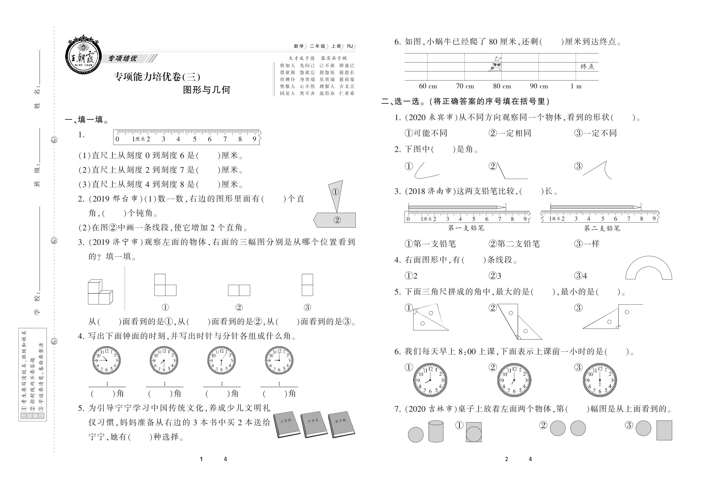 2020上册二年级数学人教版 专项能力培优卷(三) 图形与几何