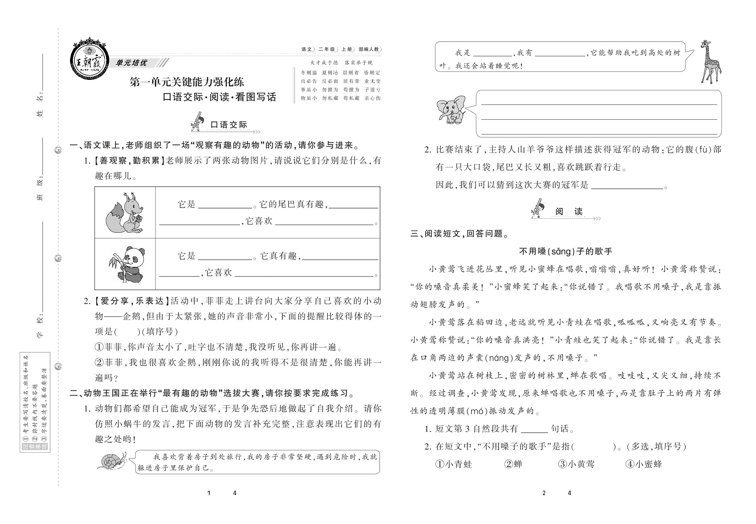2020上册二年级语文人教版 第一单元 关键能力强化练