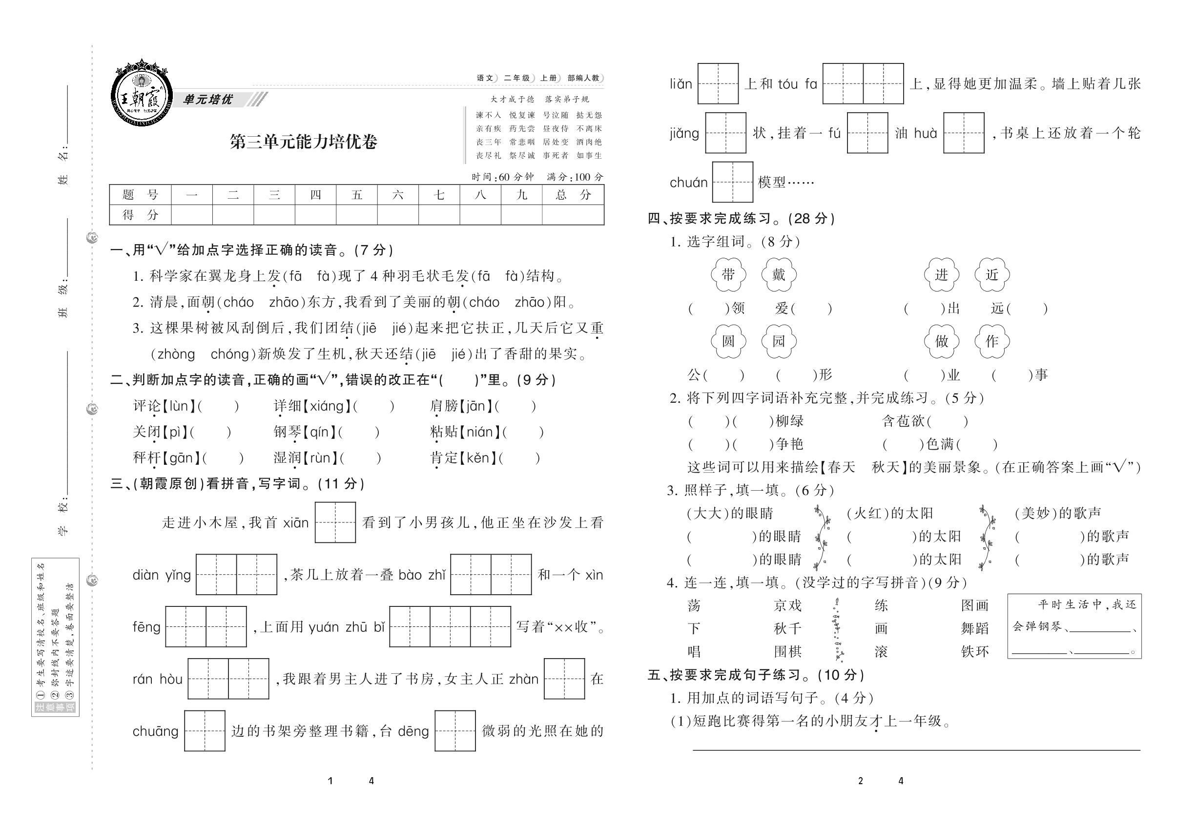 2020上册二年级语文人教版 第三单元 能力培优卷