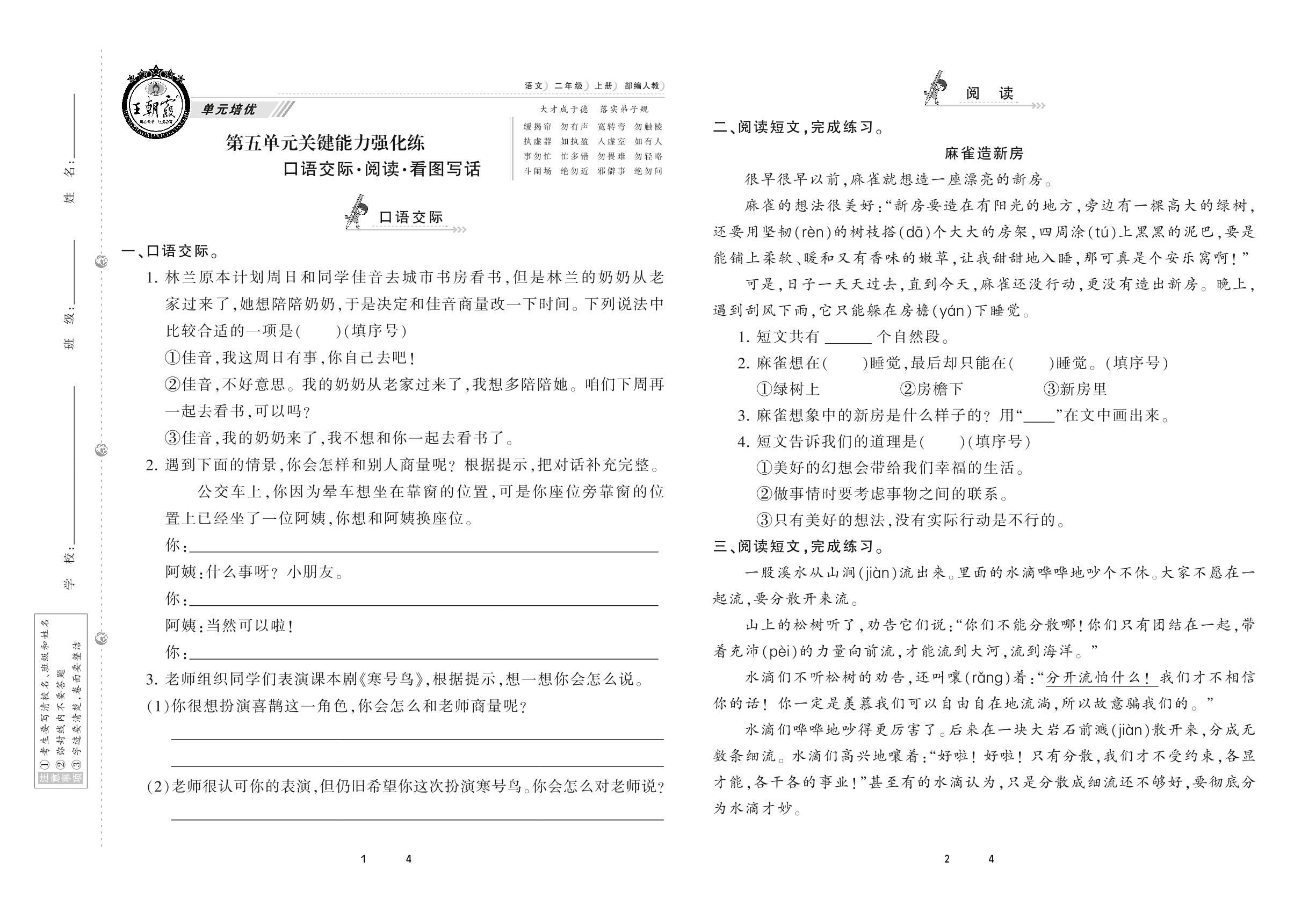 2020上册二年级语文人教版 第五单元 关键能力强化练