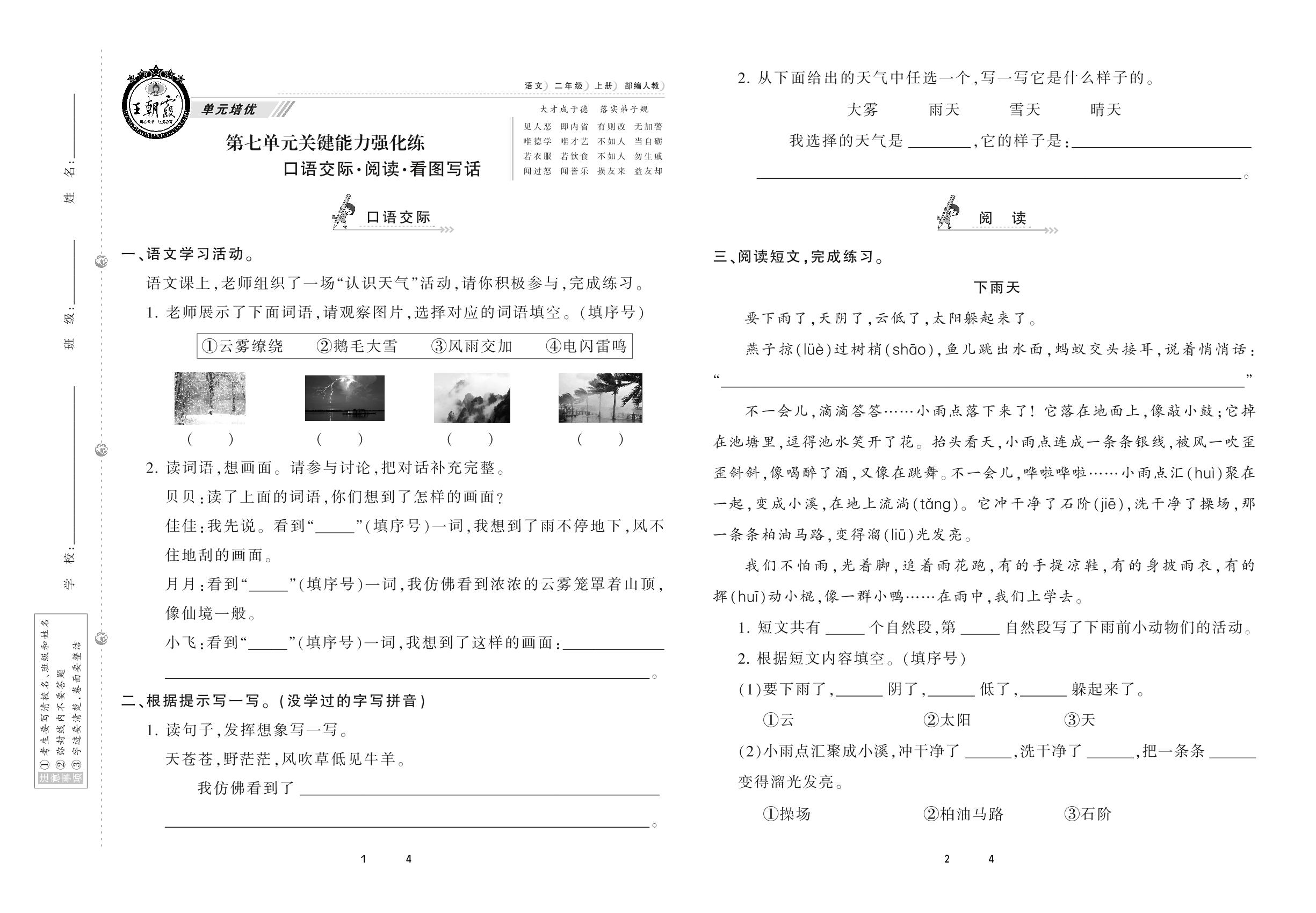 2020上册二年级语文人教版 第七单元 关键能力强化练