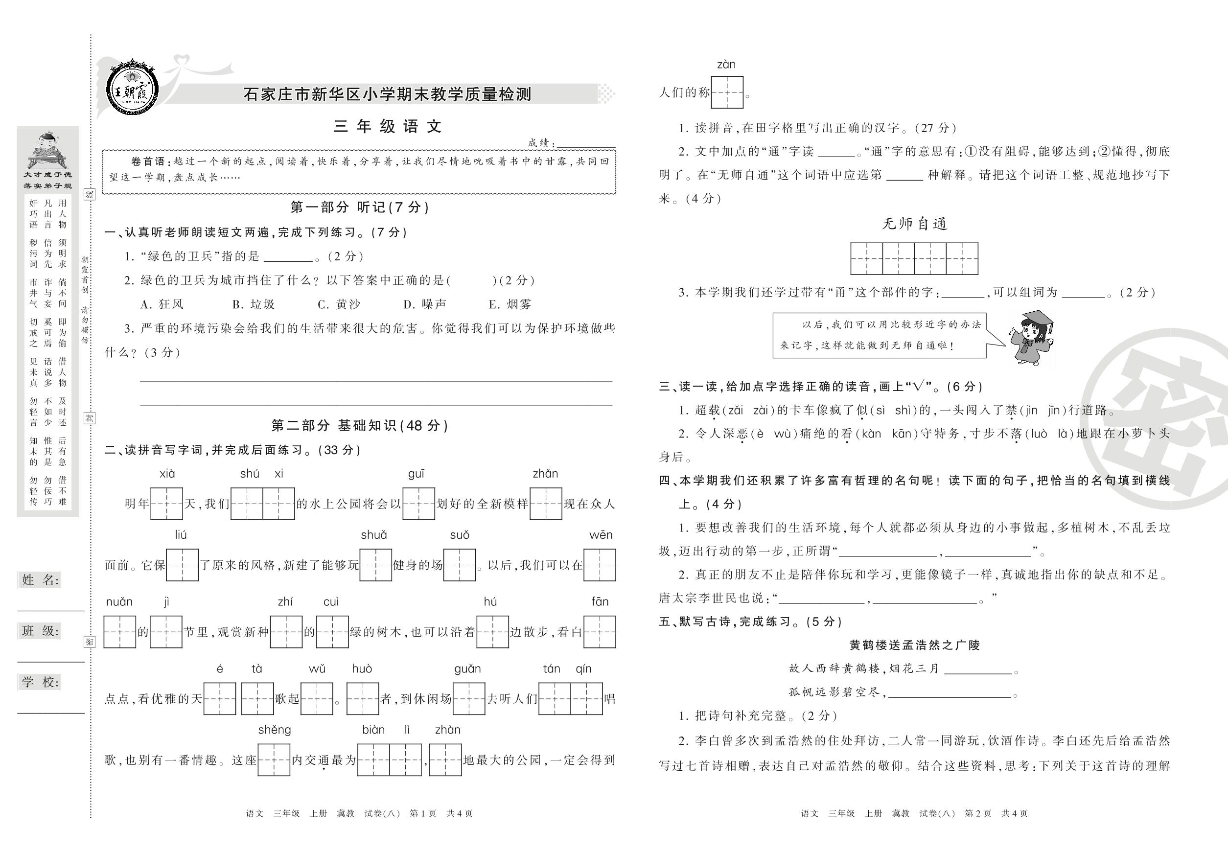 2016-2017学年第一学期石家庄市新华区三年级语文试卷(冀教版)_R210801101035【8】
