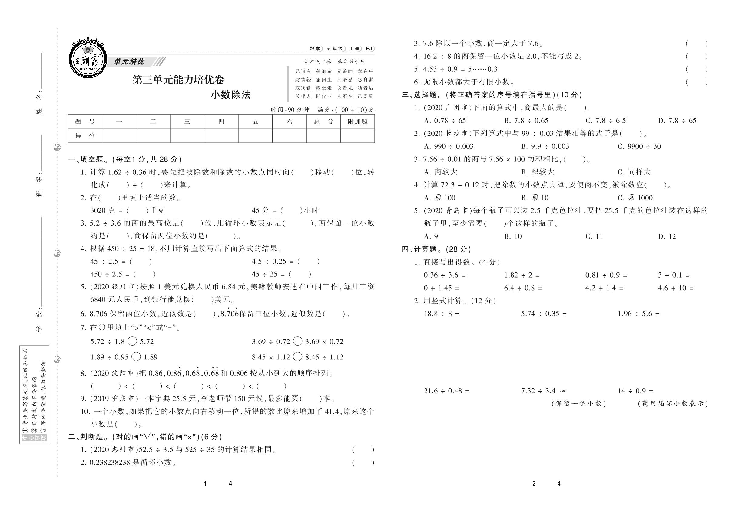 2020上册五年级数学人教版 第三单元 能力培优卷