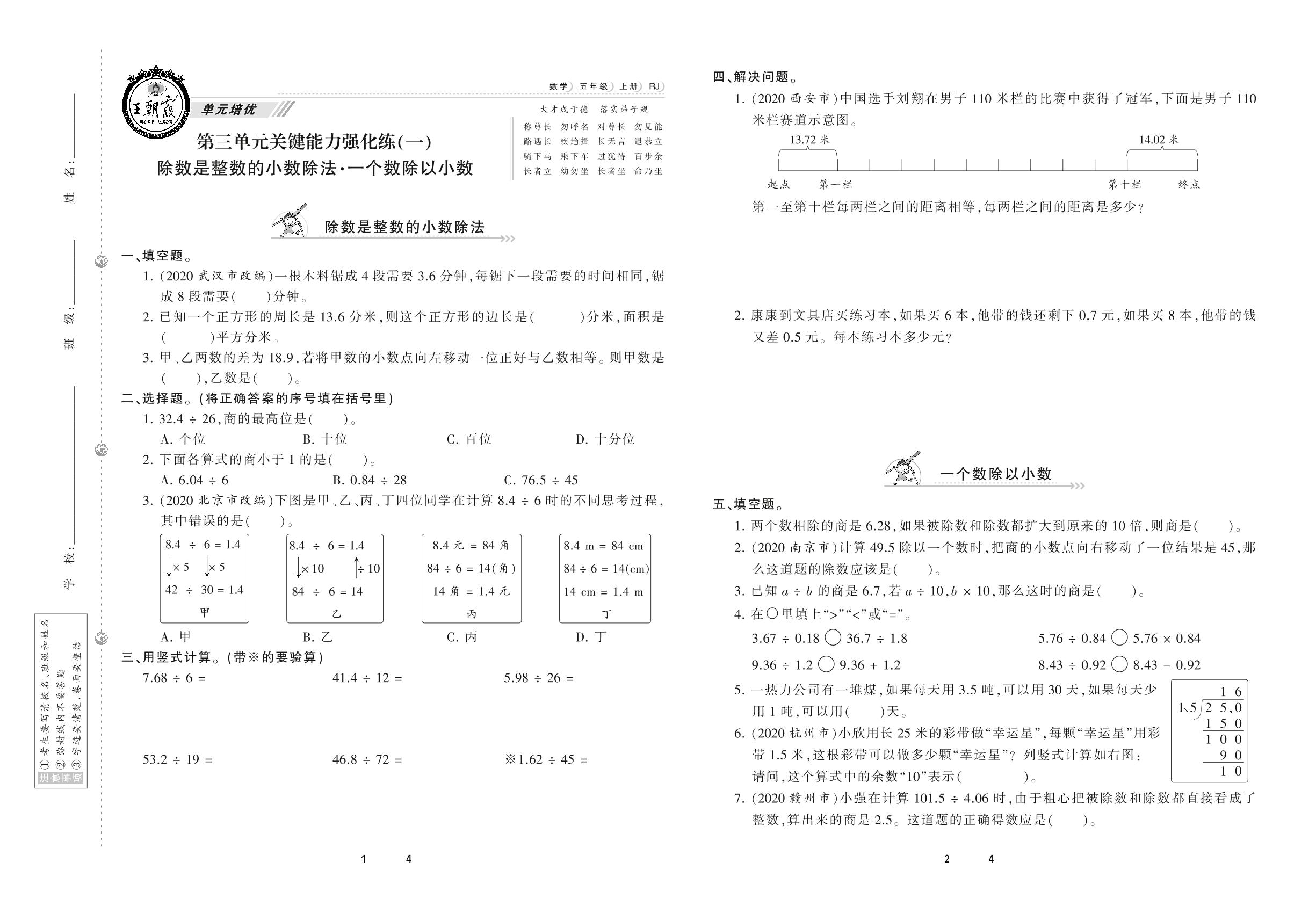 2020上册五年级数学人教版 第三单元 关键能力强化练(一)