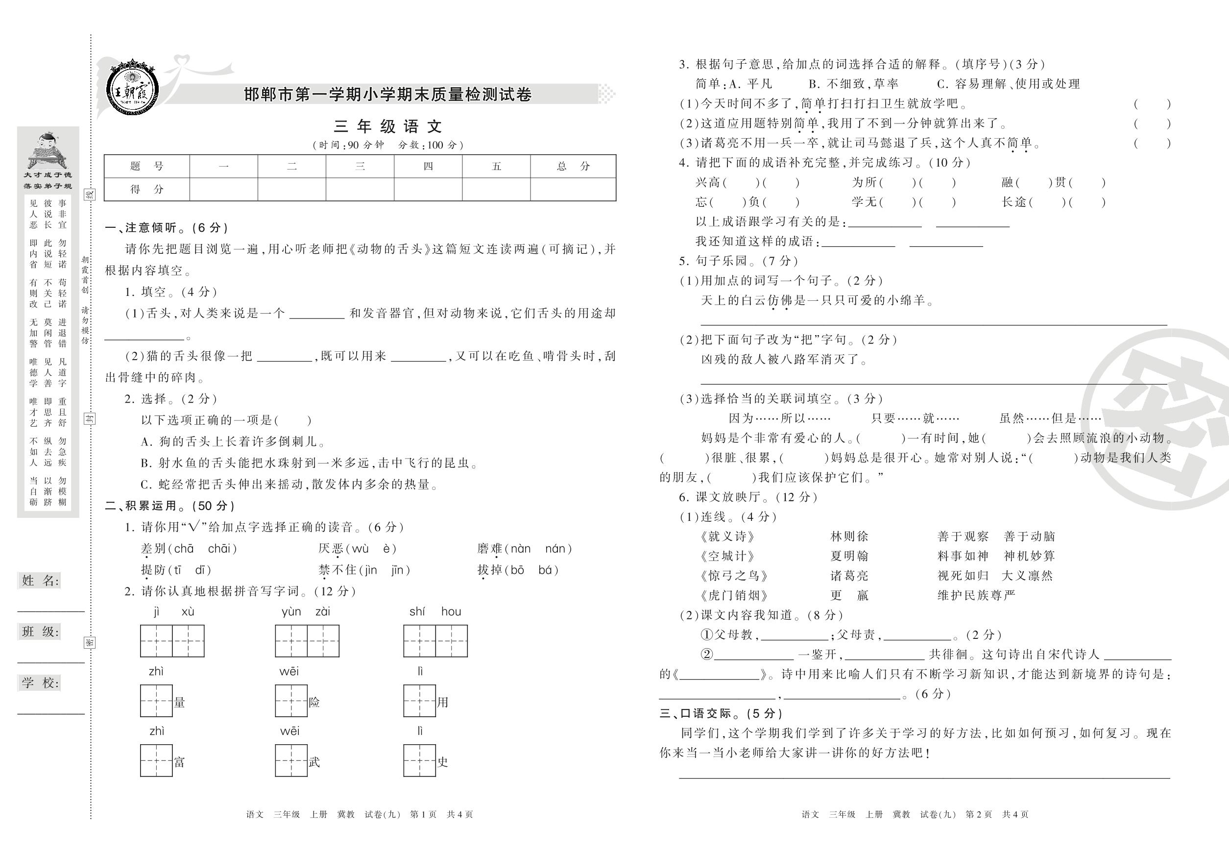 2016-2017学年第一学期邯郸市三年级语文试卷(冀教版)_R210801101047【9】