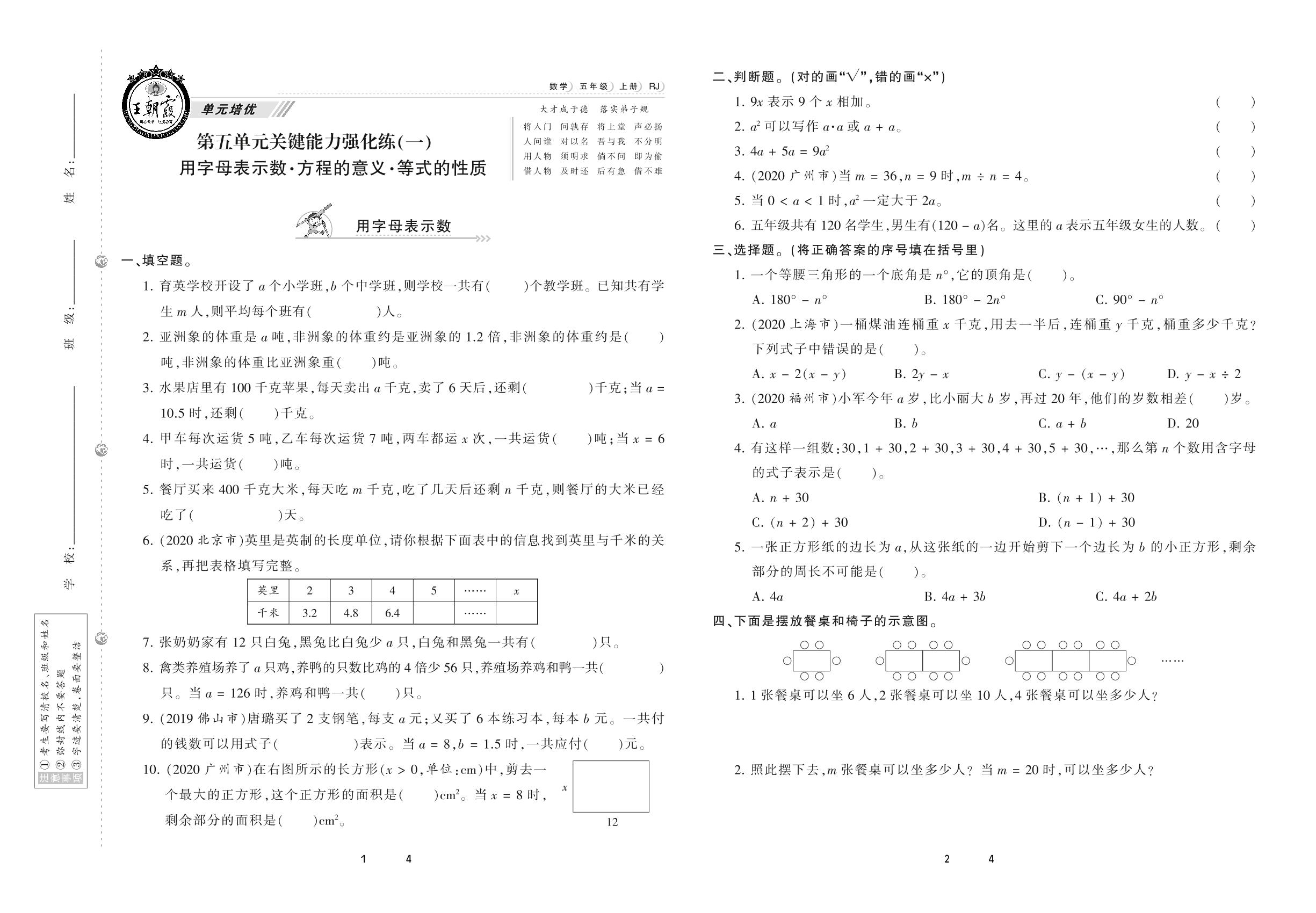 2020上册五年级数学人教版 第五单元 关键能力强化练(一)