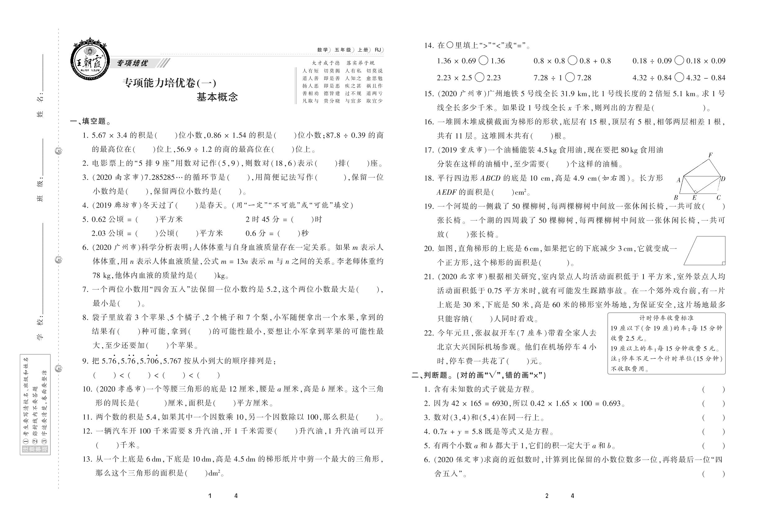 2020上册五年级数学人教版 专项能力培优卷(一) 基本概念