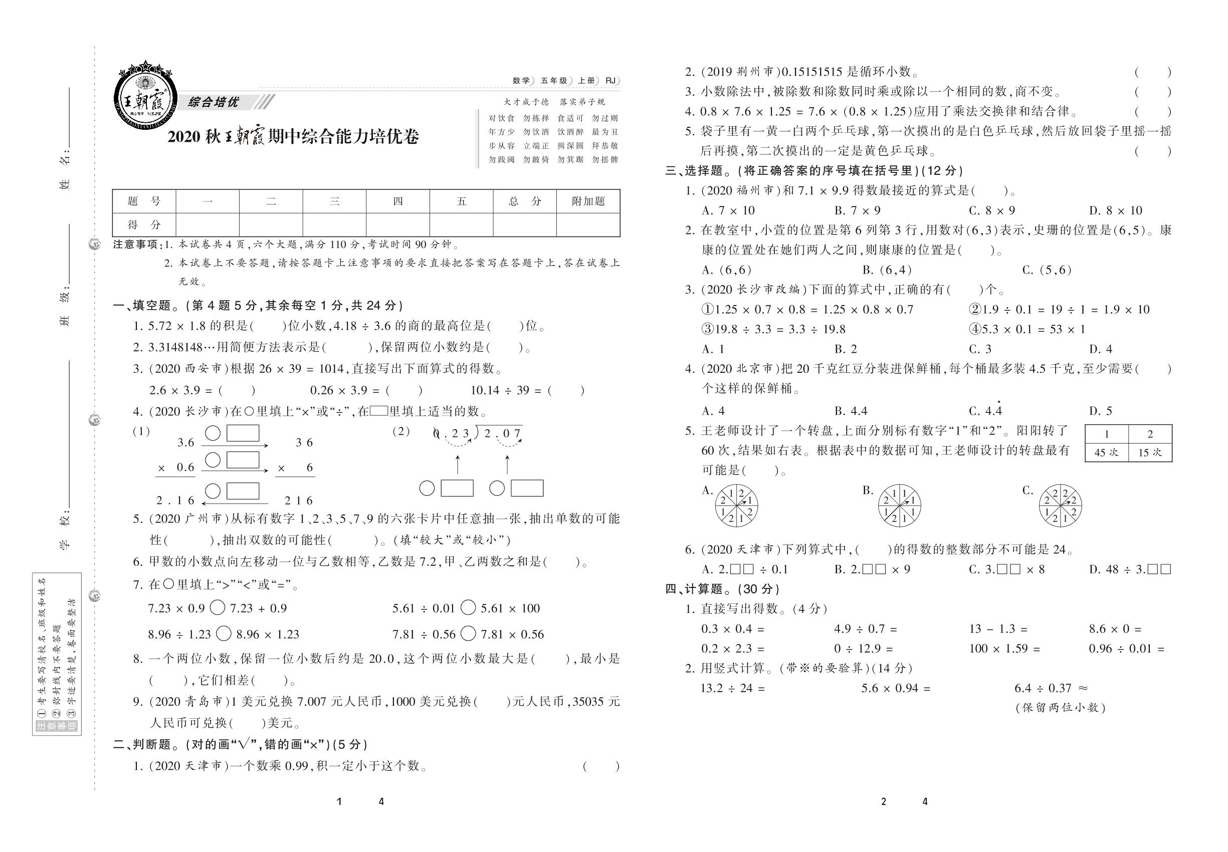 2020上册五年级数学人教版 王朝霞期中综合能力培优卷