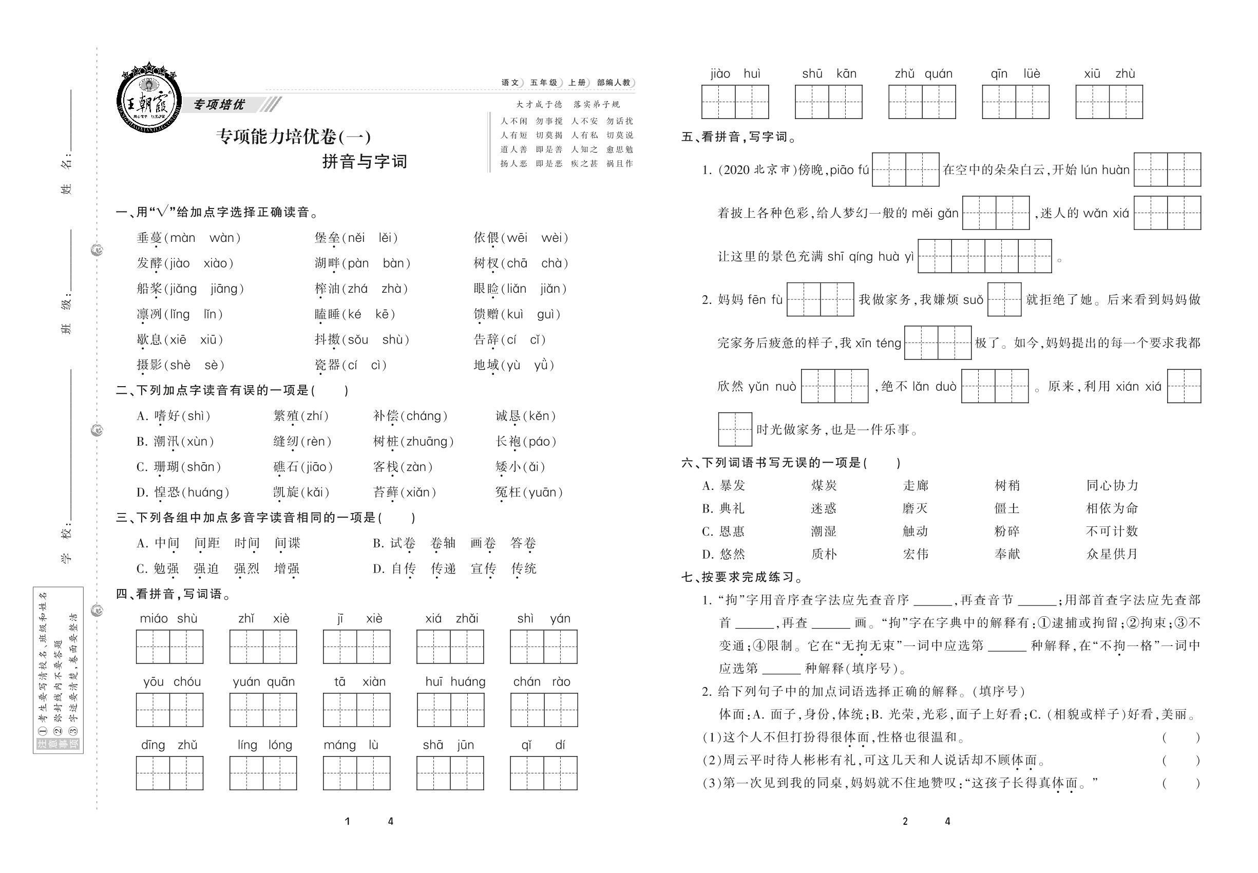 2020上册五年级语文人教版 专项能力培优卷(一) 拼音与字词