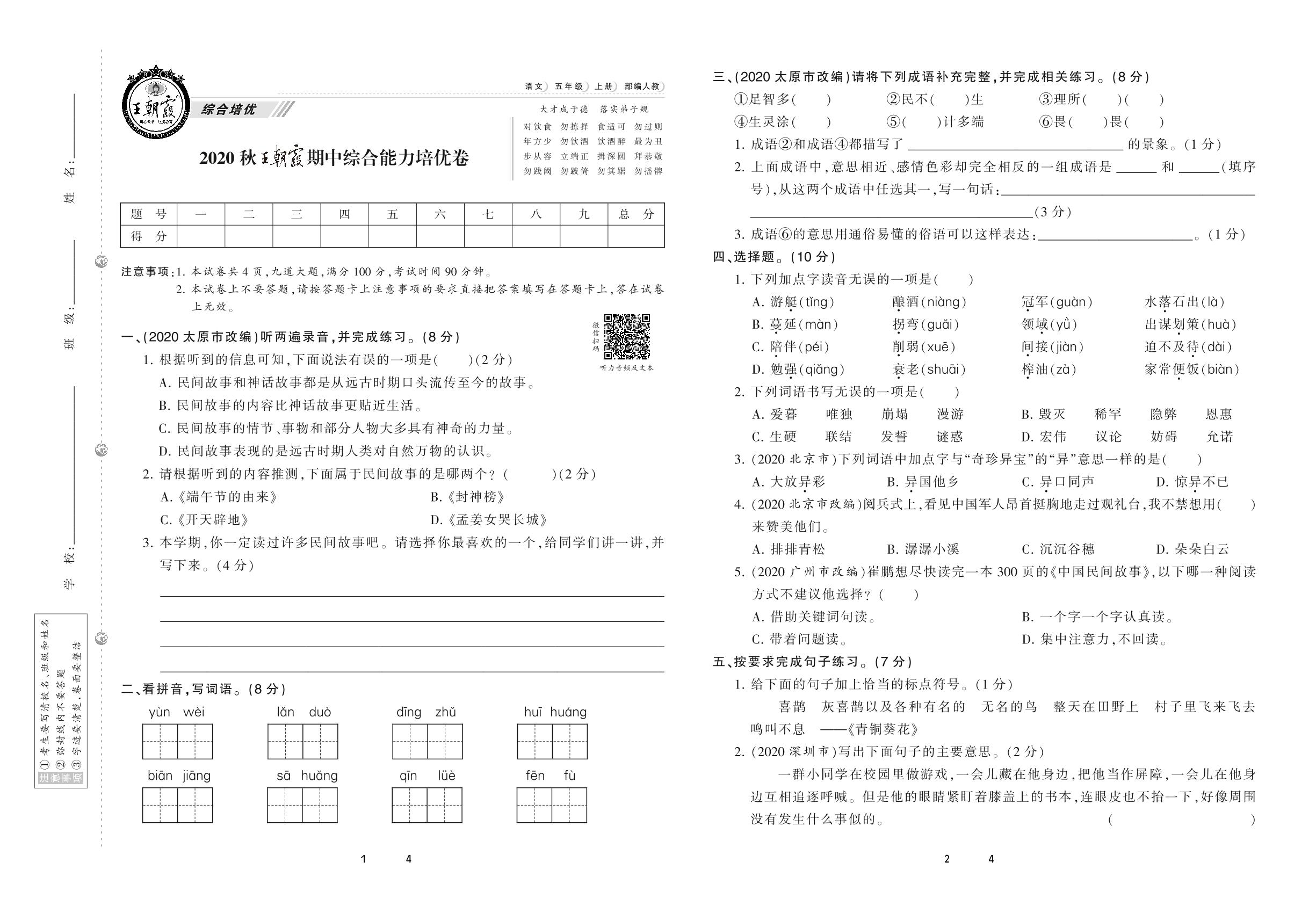 2020上册五年级语文人教版 王朝霞期中综合能力培优卷