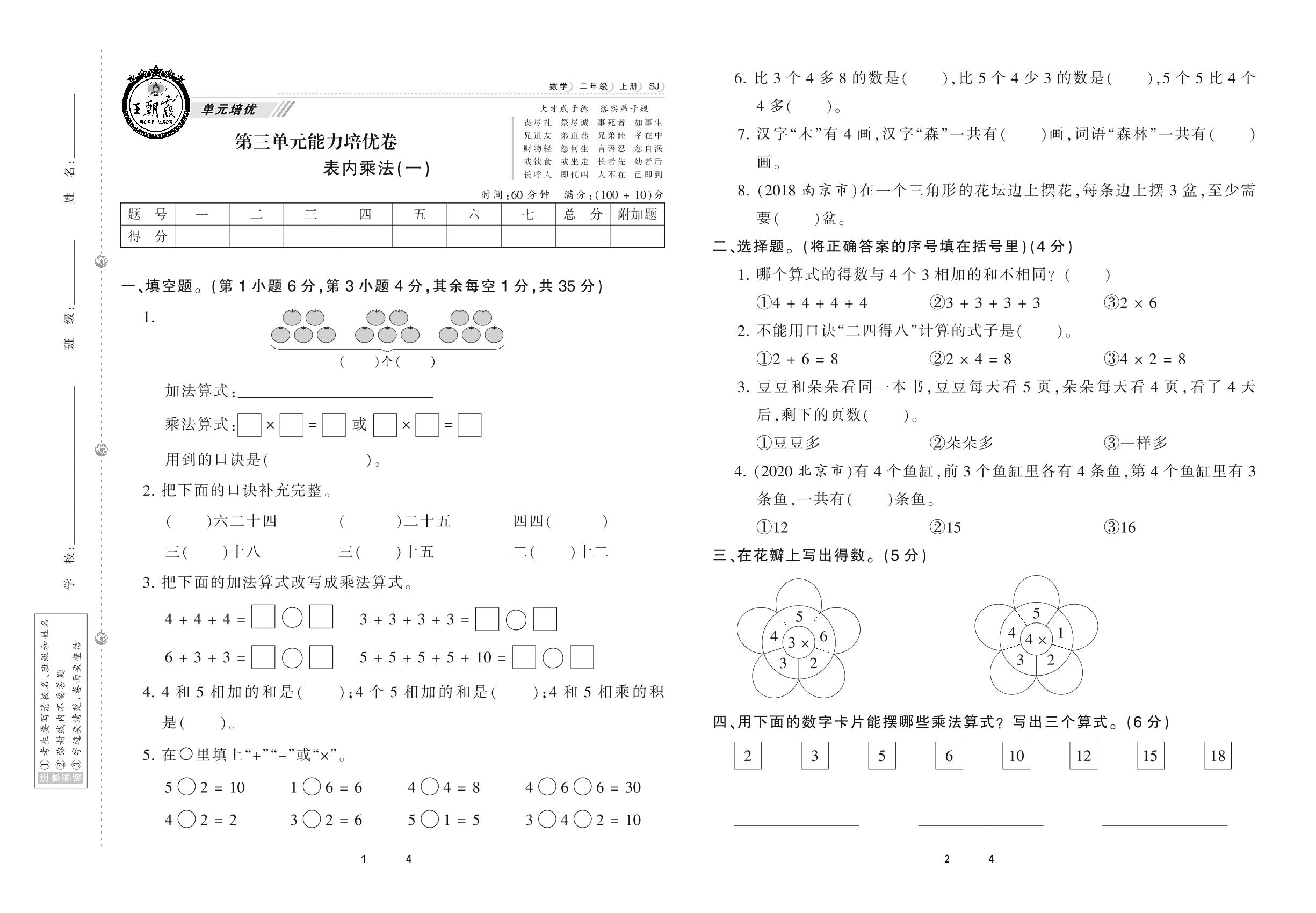 2020上册二年级数学苏教版 第三单元 能力培优卷