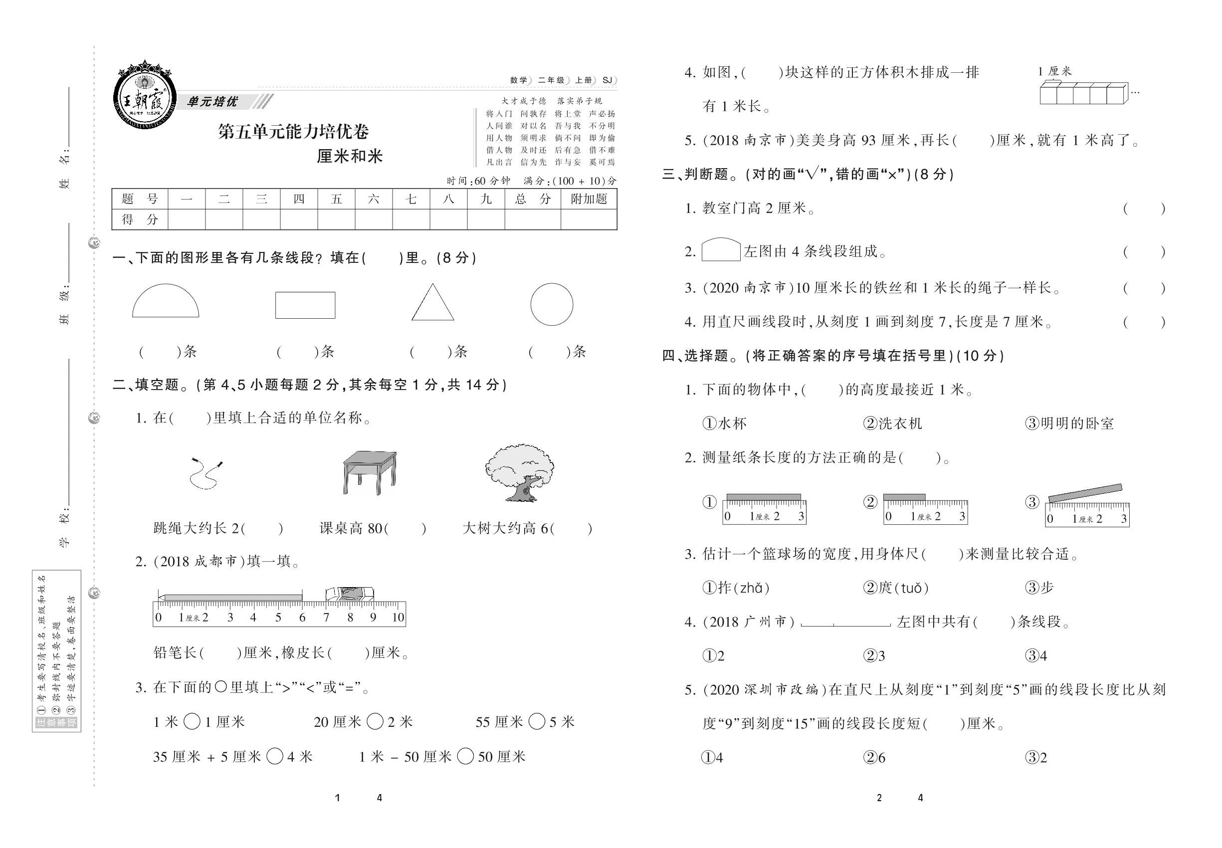 2020上册二年级数学苏教版 第五单元 能力培优卷