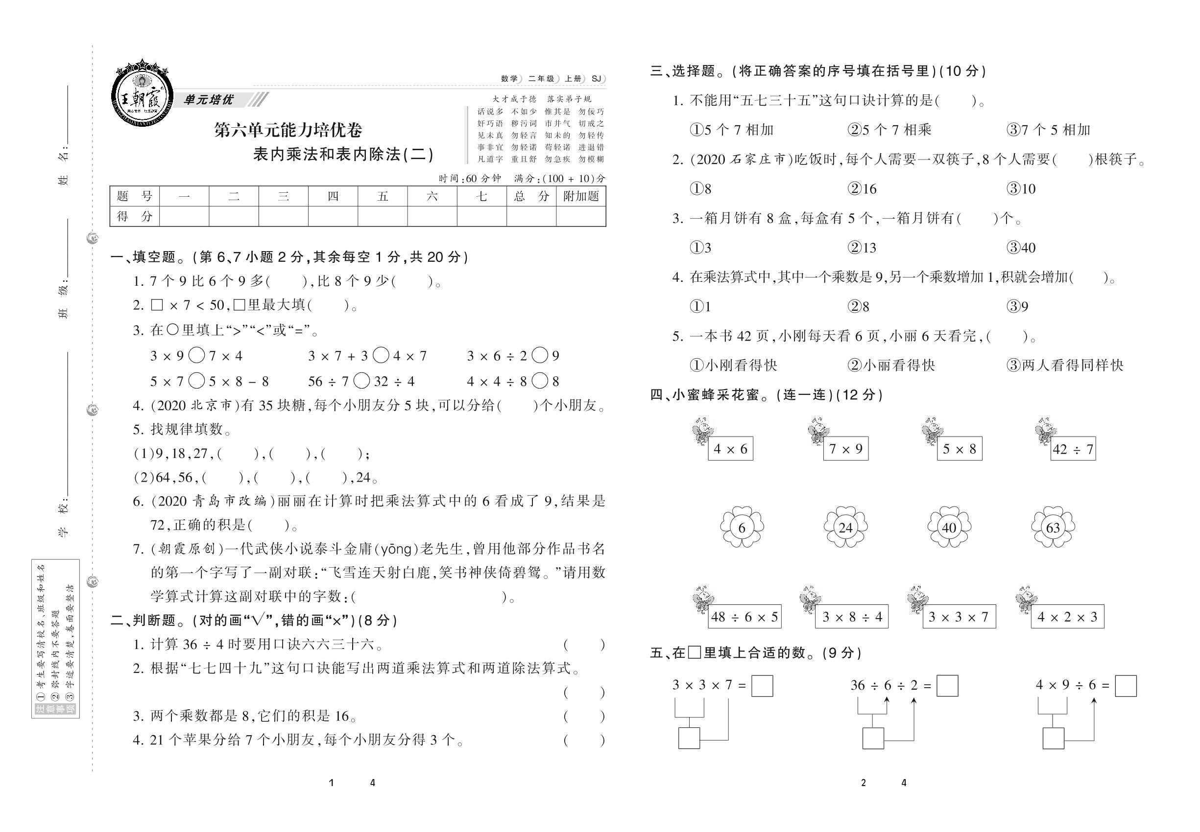 2020上册二年级数学苏教版 第六单元 能力培优卷