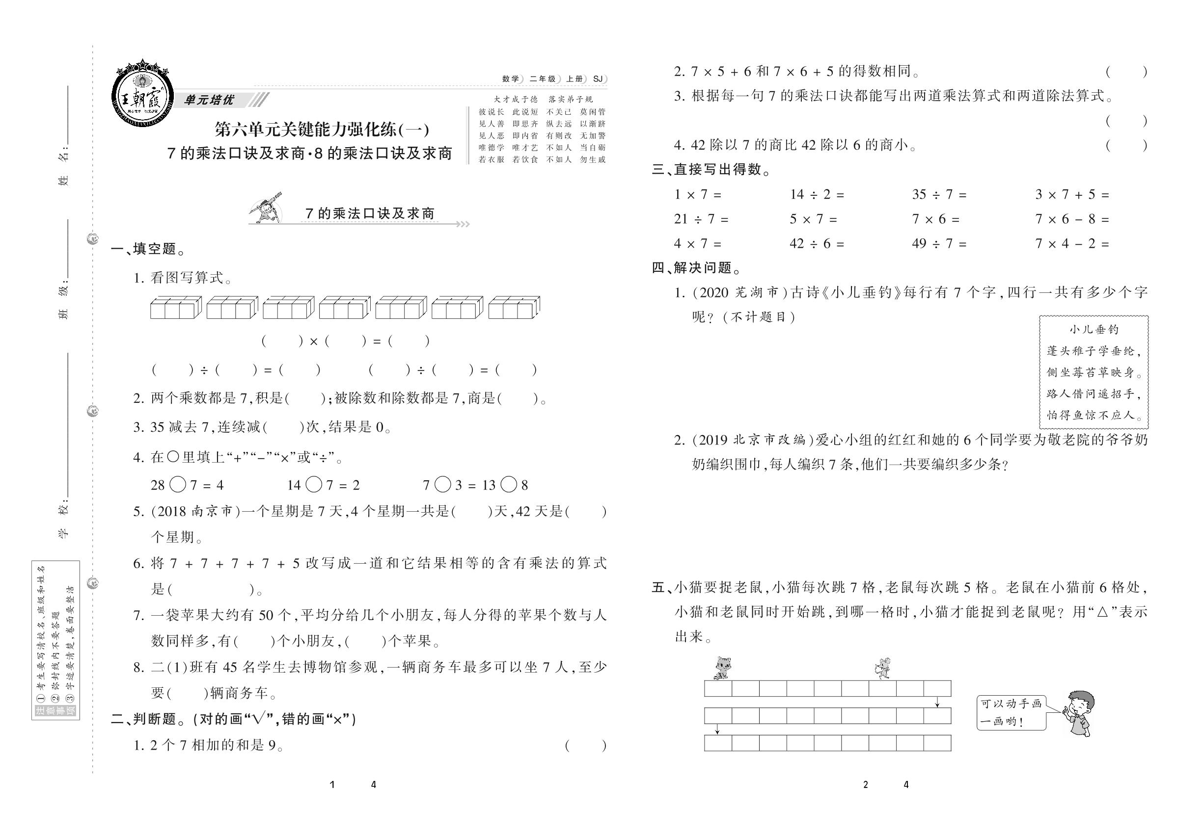 2020上册二年级数学苏教版 第六单元 关键能力强化练(一)