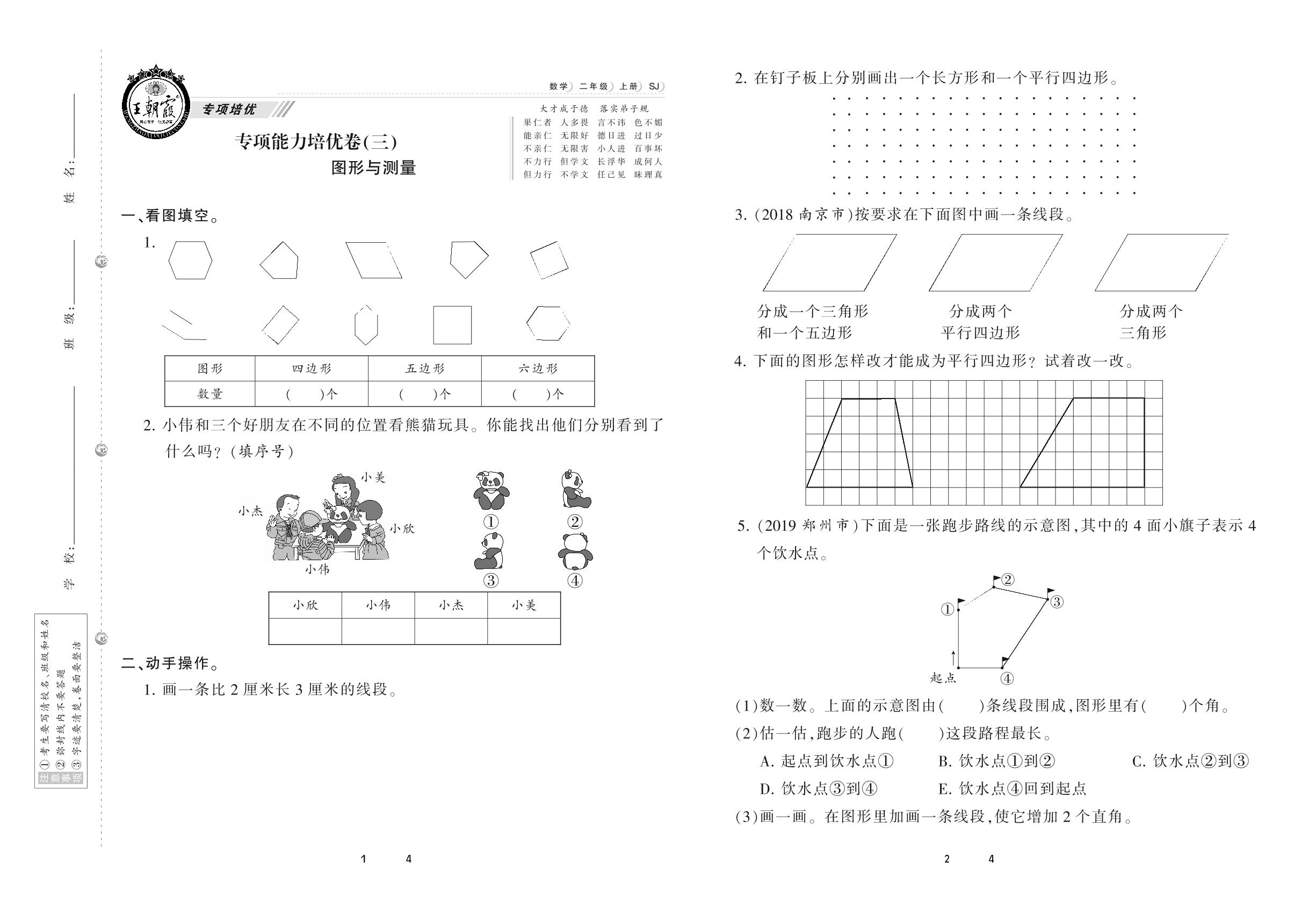 2020上册二年级数学苏教版 专项能力培优卷(三) 图形与测量