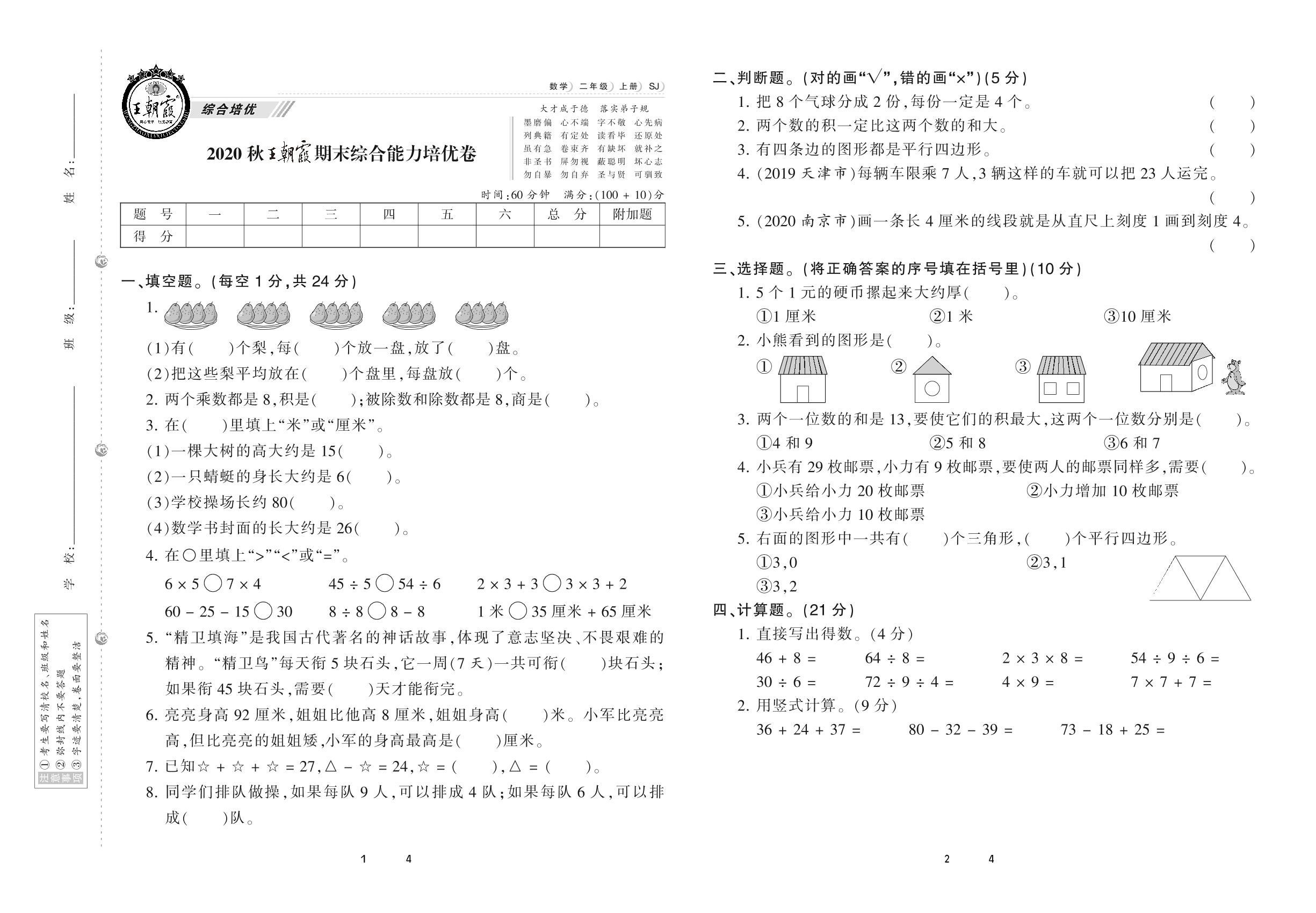 2020上册二年级数学苏教版 王朝霞期末综合能力培优卷