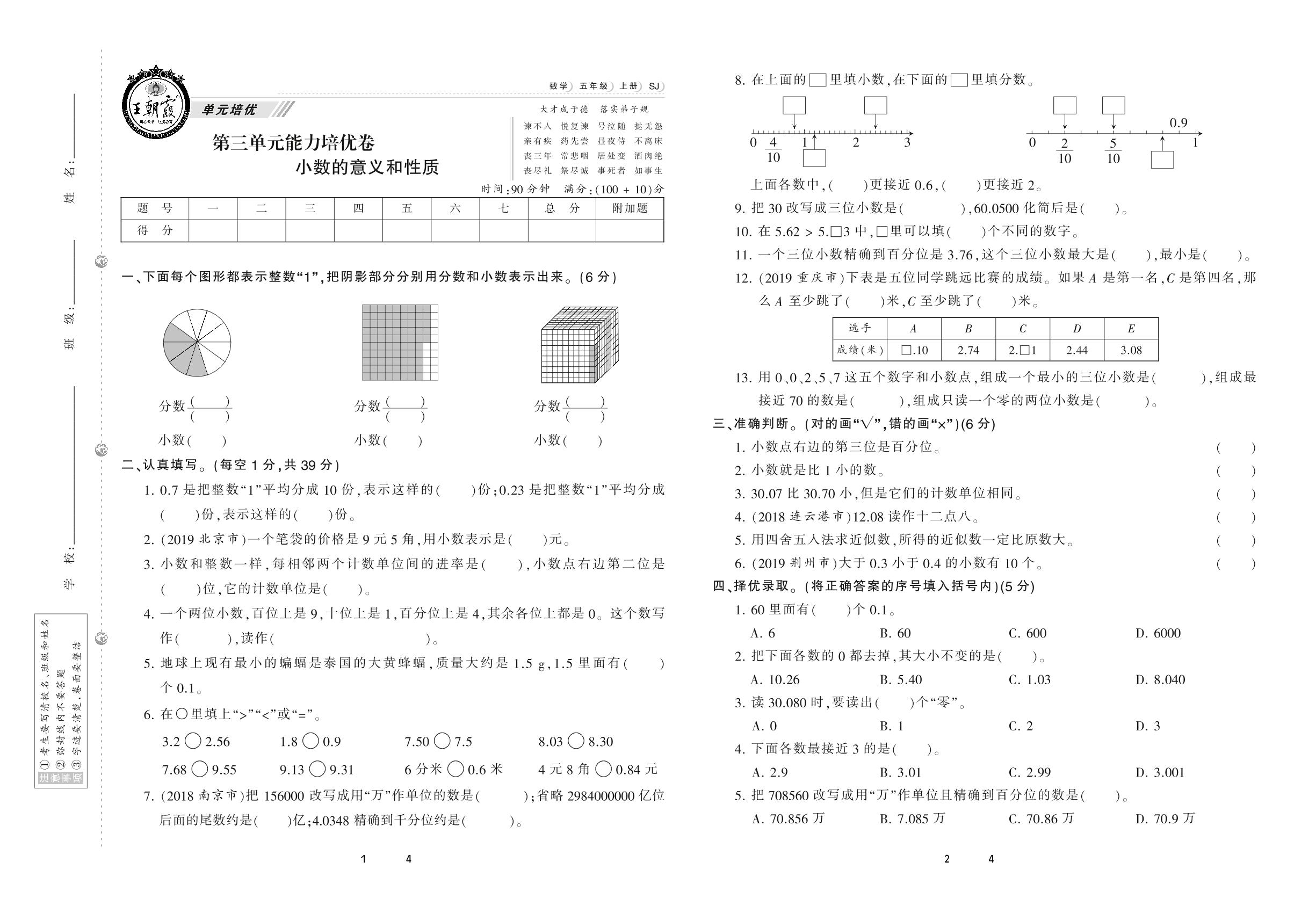 2020上册五年级数学苏教版 第三单元 能力培优卷