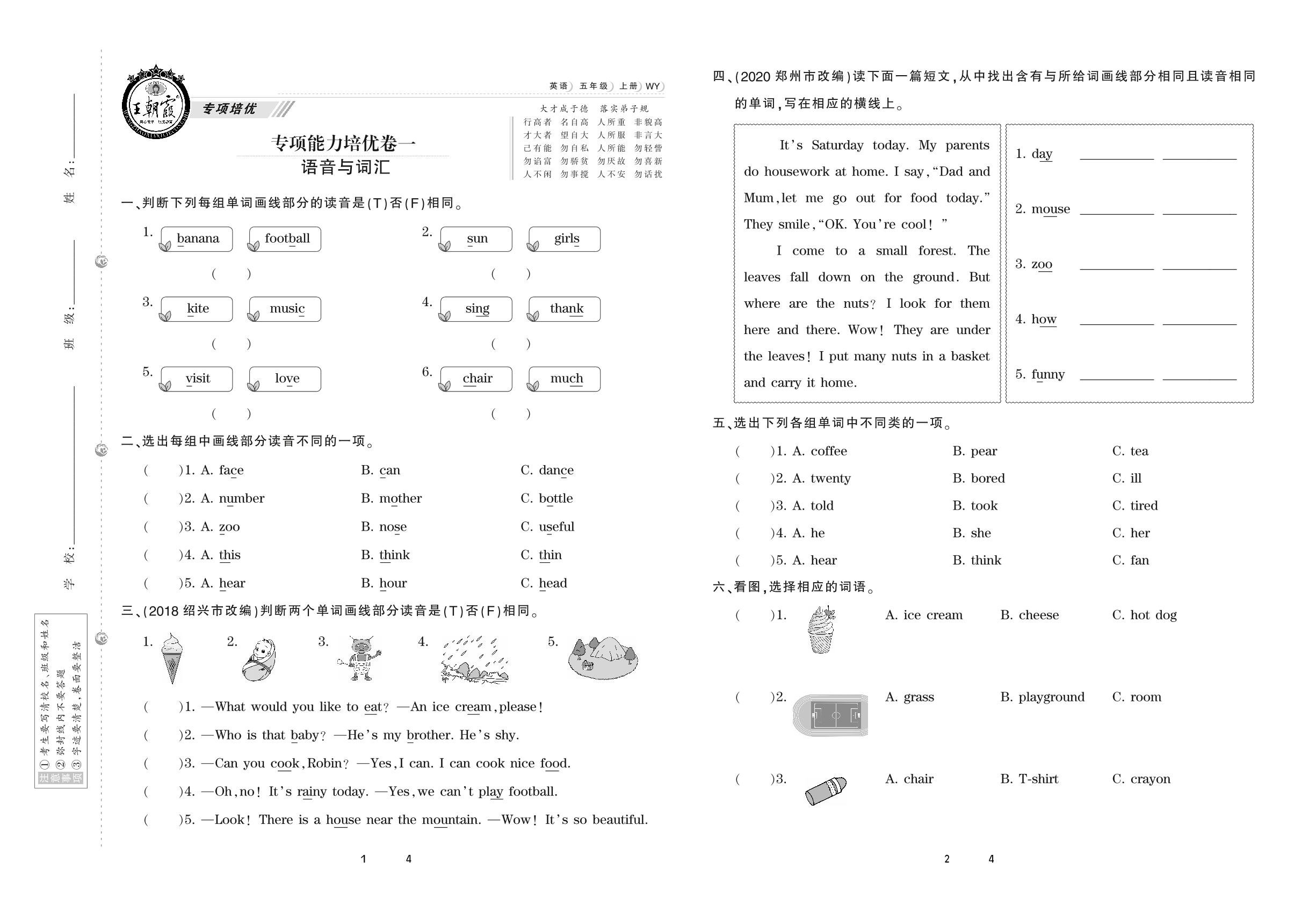 2020上册五年级英语外研版 专项能力培优卷一 语音与词汇