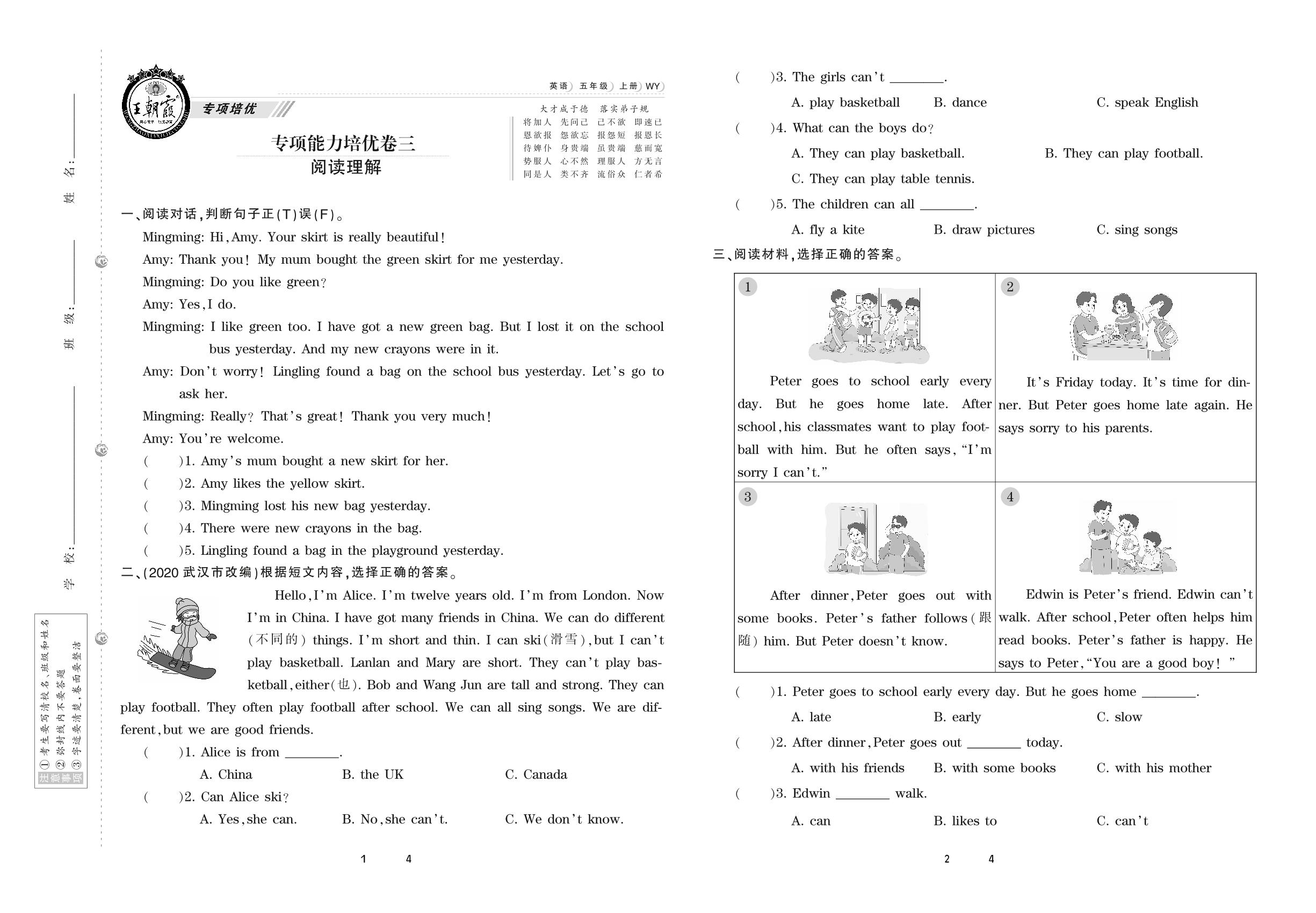 2020上册五年级英语外研版 专项能力培优卷三 阅读理解