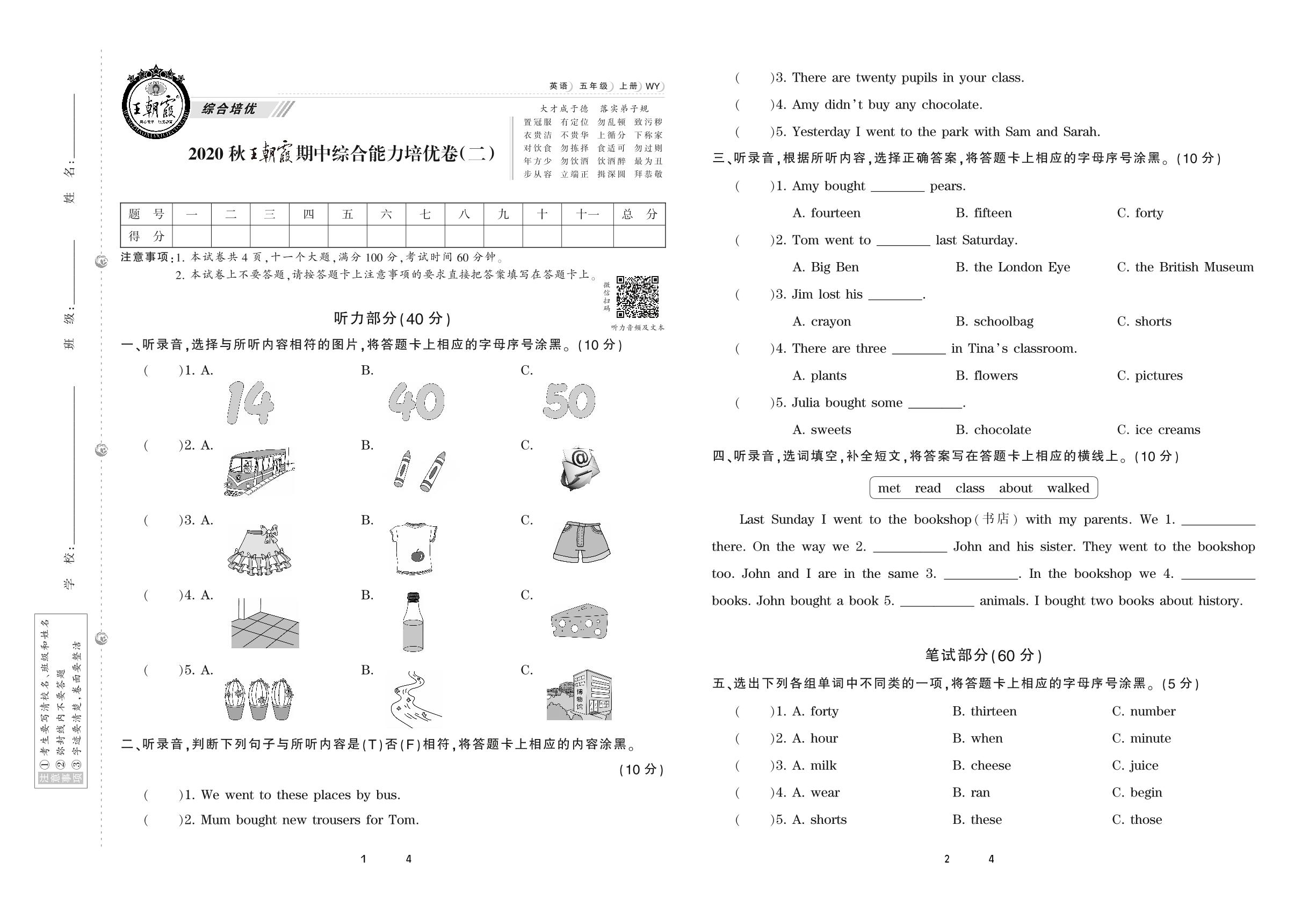 2020上册五年级英语外研版 王朝霞期中综合能力培优卷(二)
