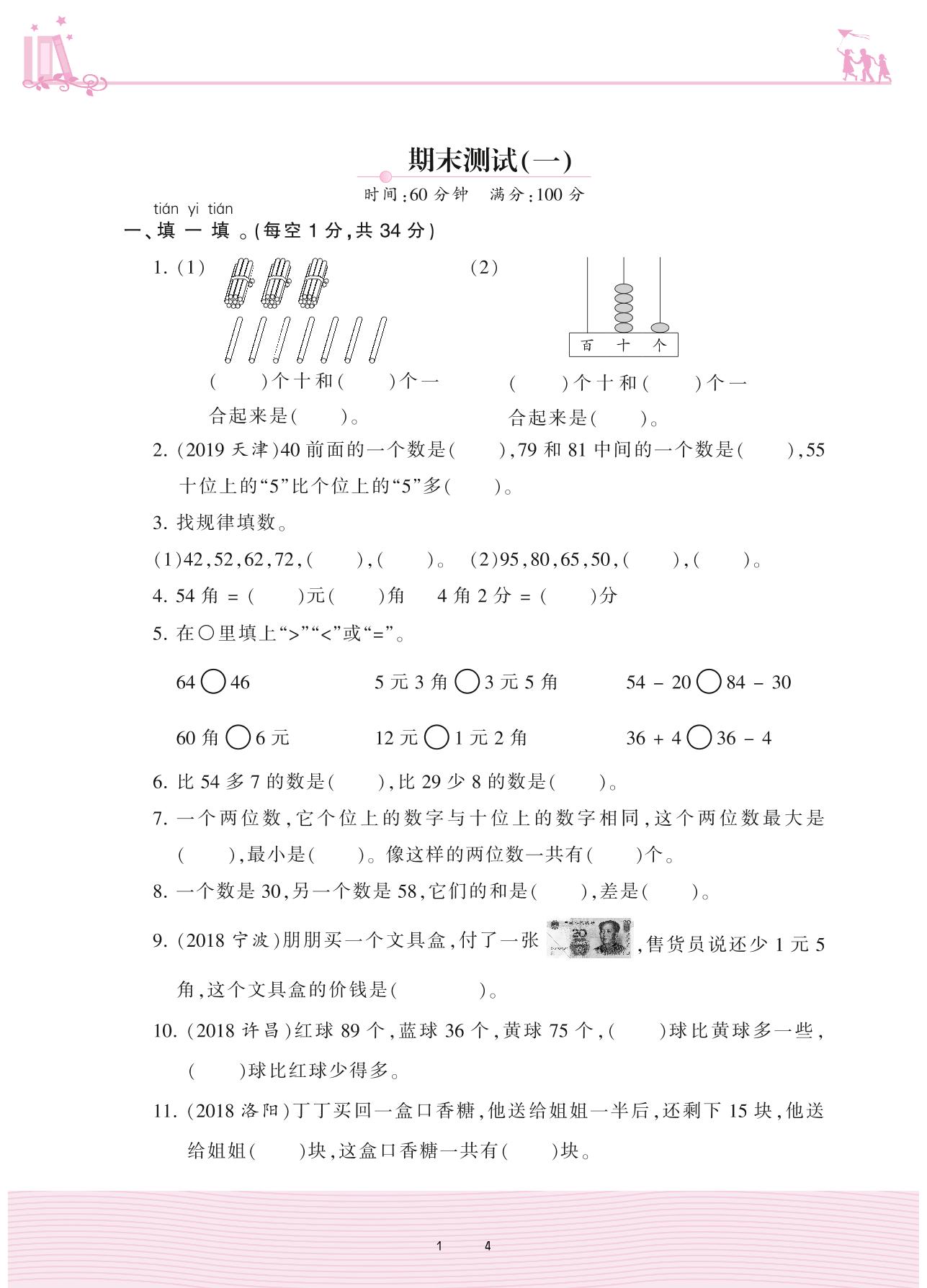 一年级数学苏教版下册期末卷