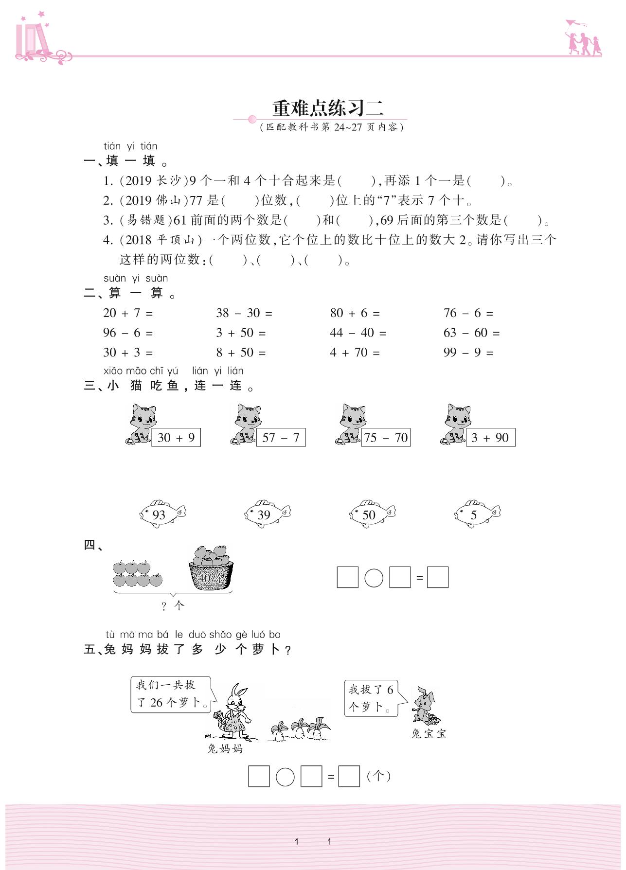 2021下册一年级数学苏教版 三 认识100以内的数——重难点练习二