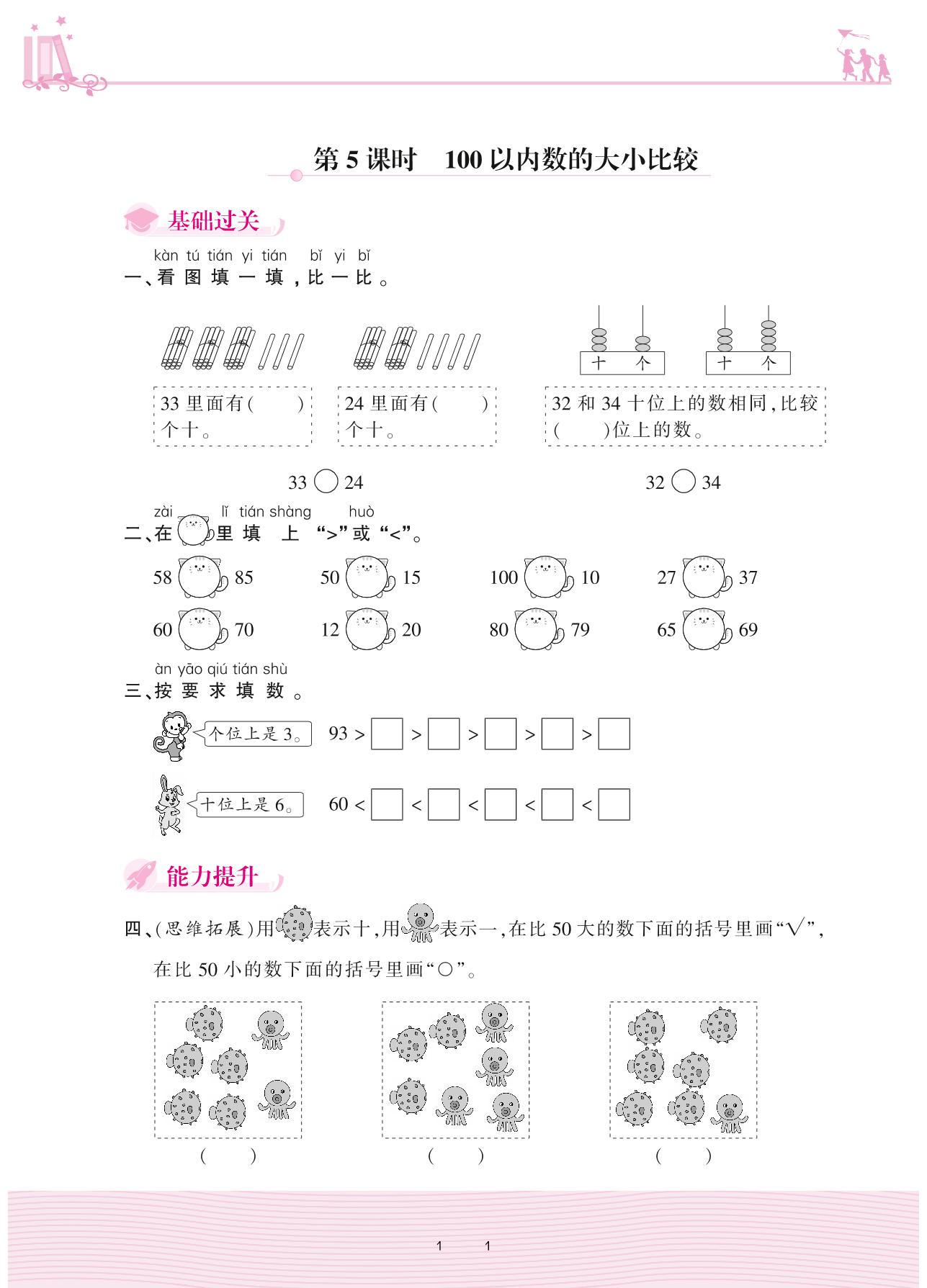 2021下册一年级数学苏教版 三 认识100以内的数——第5课时 100以内数的大小比较