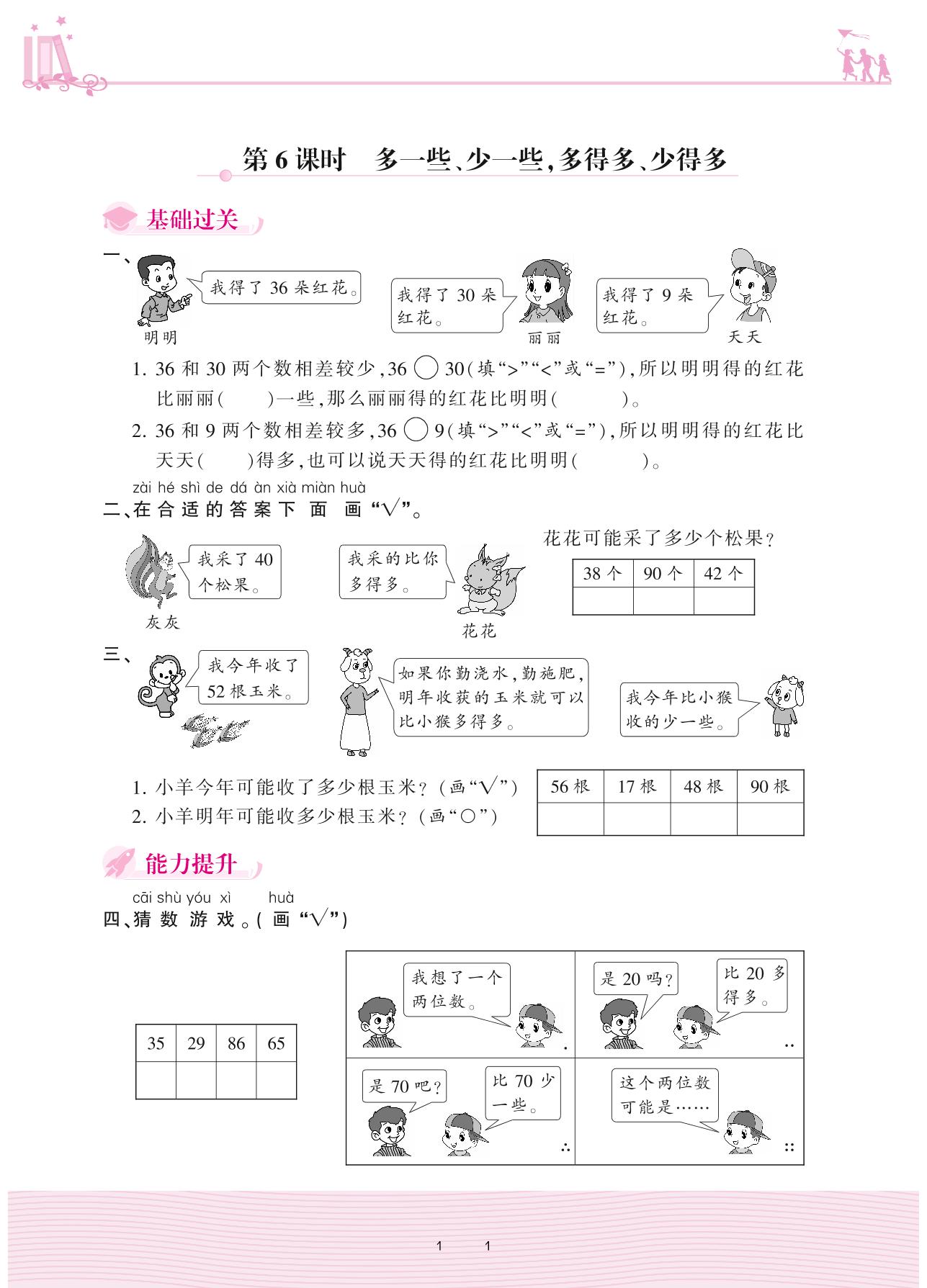 2021下册一年级数学苏教版 三 认识100以内的数——第6课时 多一些、少一些,多得多、少得多