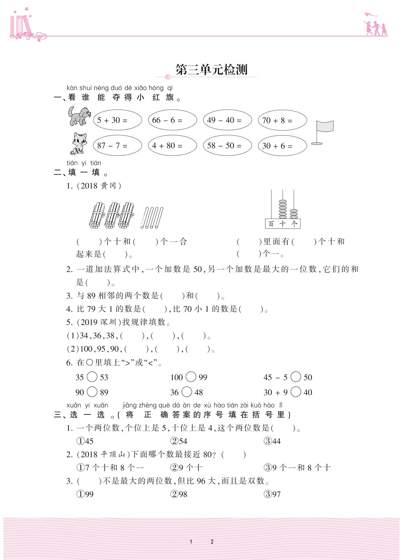 2021下册一年级数学苏教版 三 认识100以内的数——第三单元检测