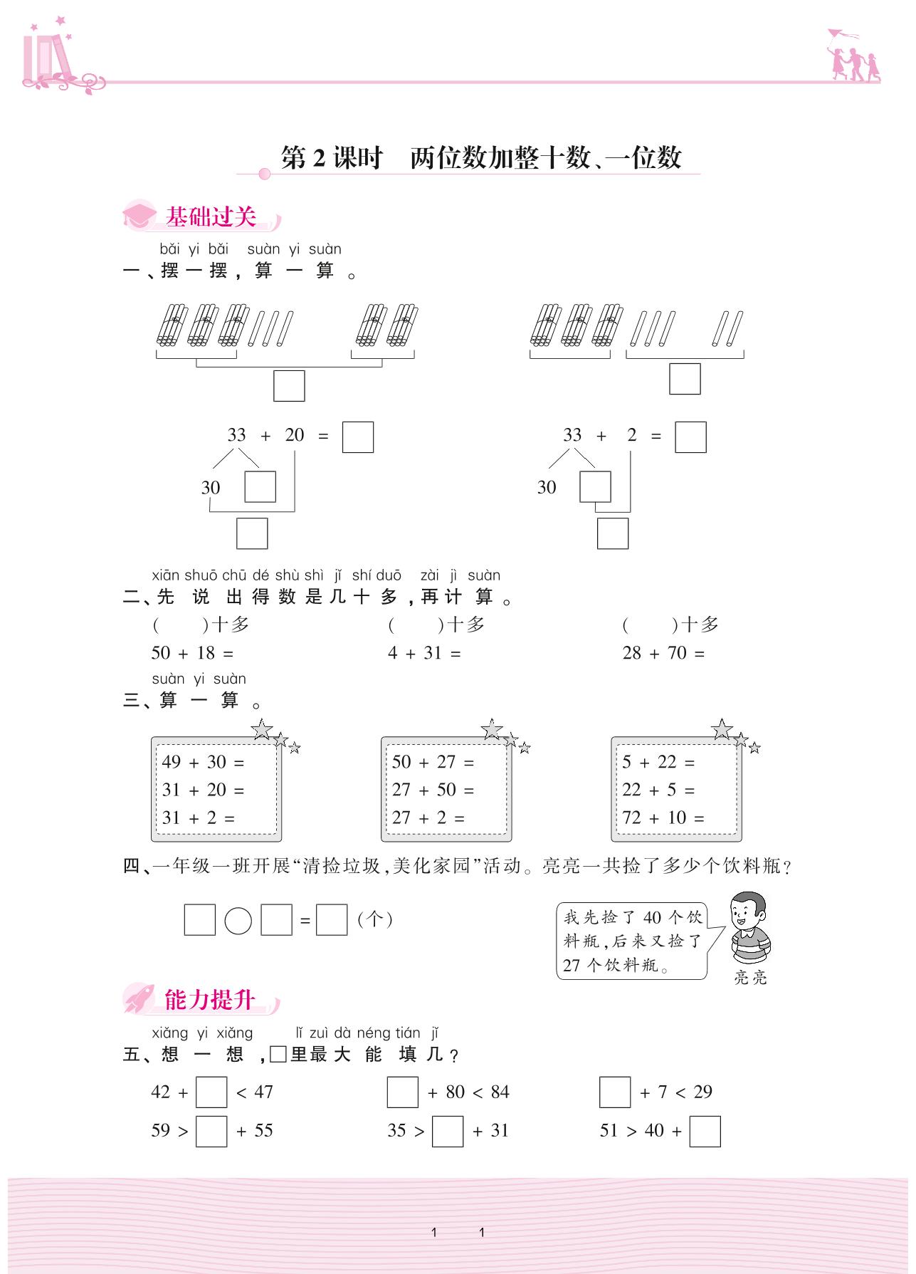 2021下册一年级数学苏教版 四 100以内的加法和减法(一)——第2课时 两位数加整十数、一位数