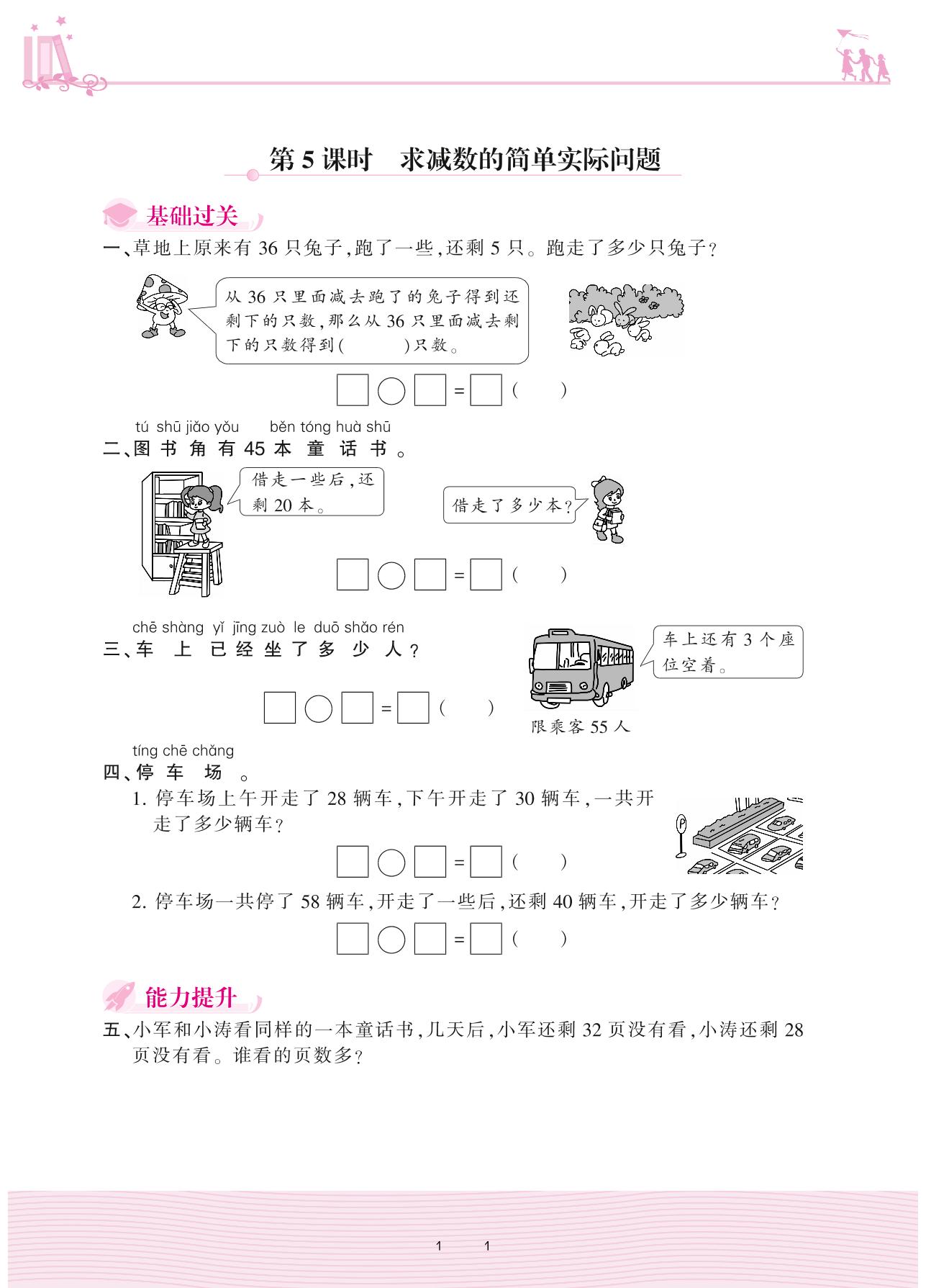 2021下册一年级数学苏教版 四 100以内的加法和减法(一)——第5课时 求减数的简单实际问题