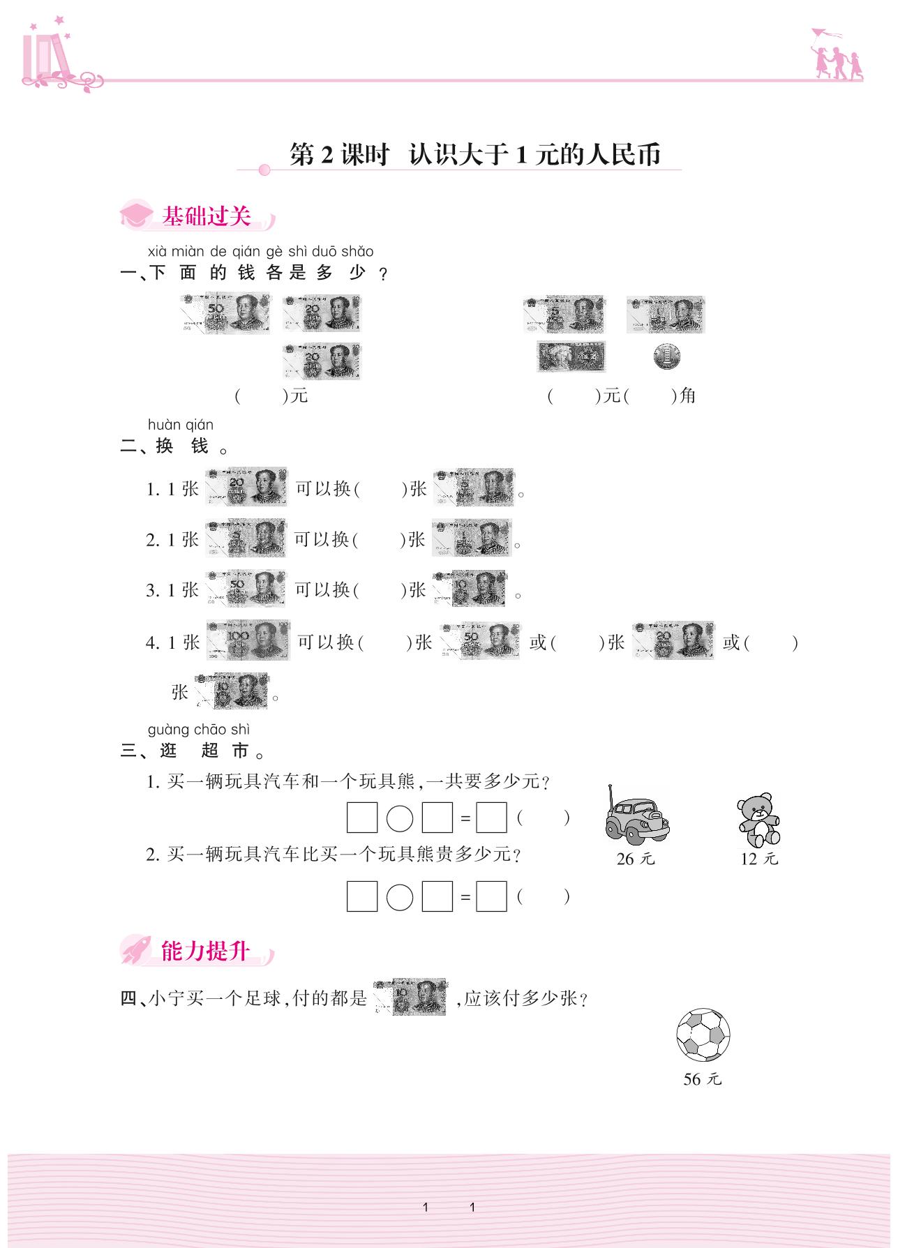 2021下册一年级数学苏教版 五 元、角、分——第2课时 认识大于1元的人民币