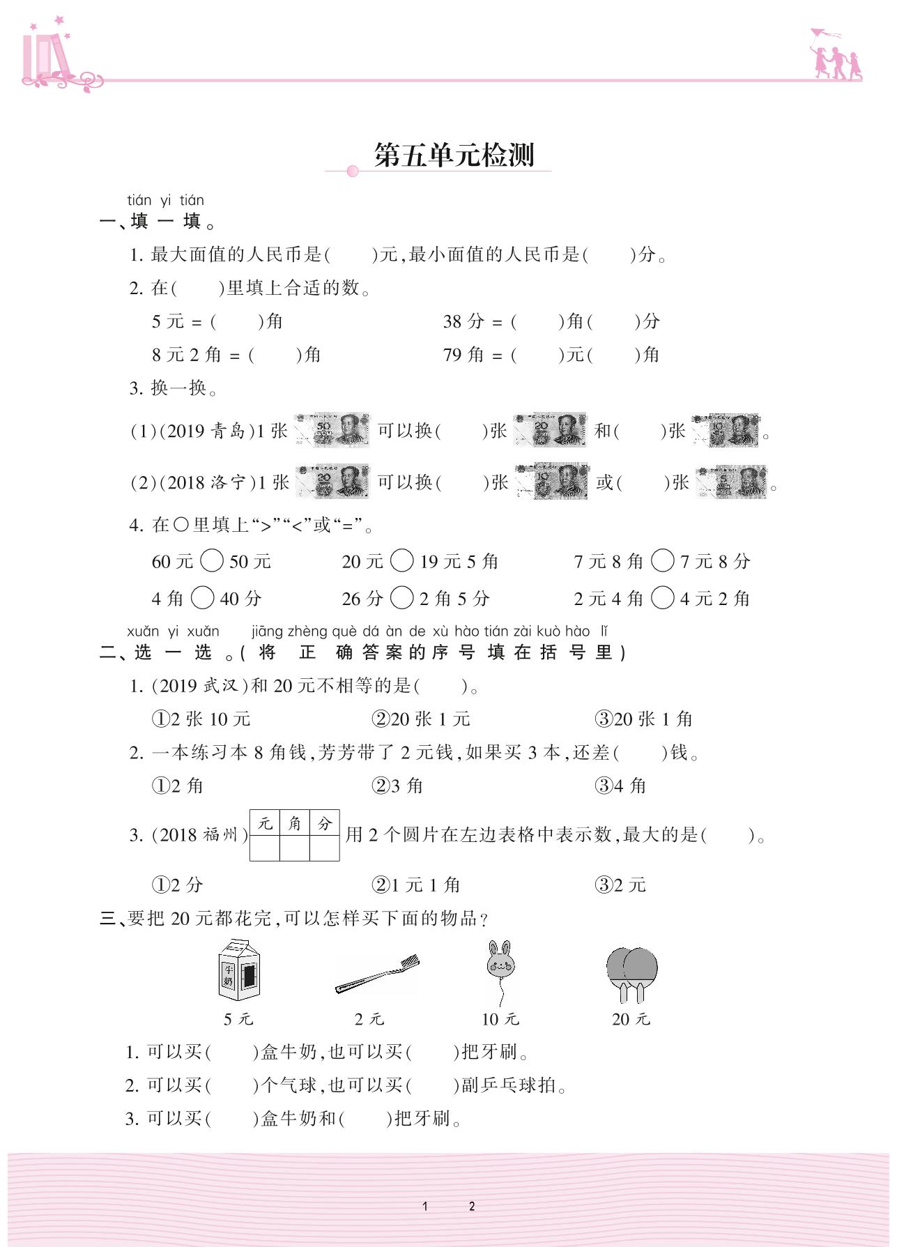 2021下册一年级数学苏教版 五 元、角、分——第五单元检测