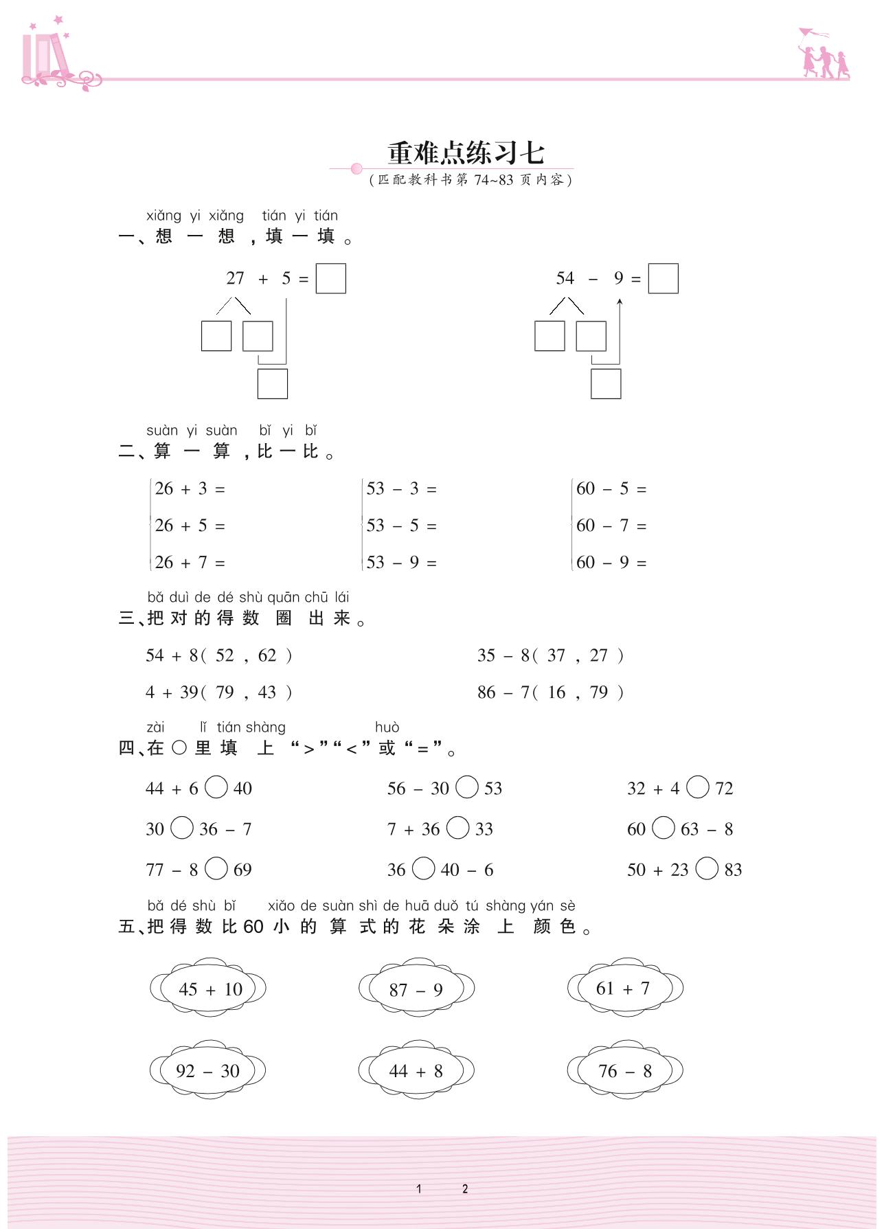 2021下册一年级数学苏教版 六 100以内的加法和减法(二)——重难点练习七
