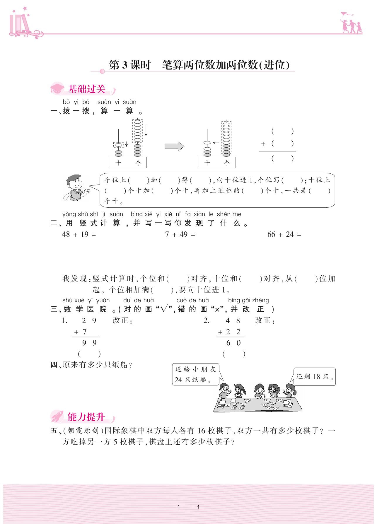 2021下册一年级数学苏教版 六 100以内的加法和减法(二)——第3课时 笔算两位数加两位数(进位)
