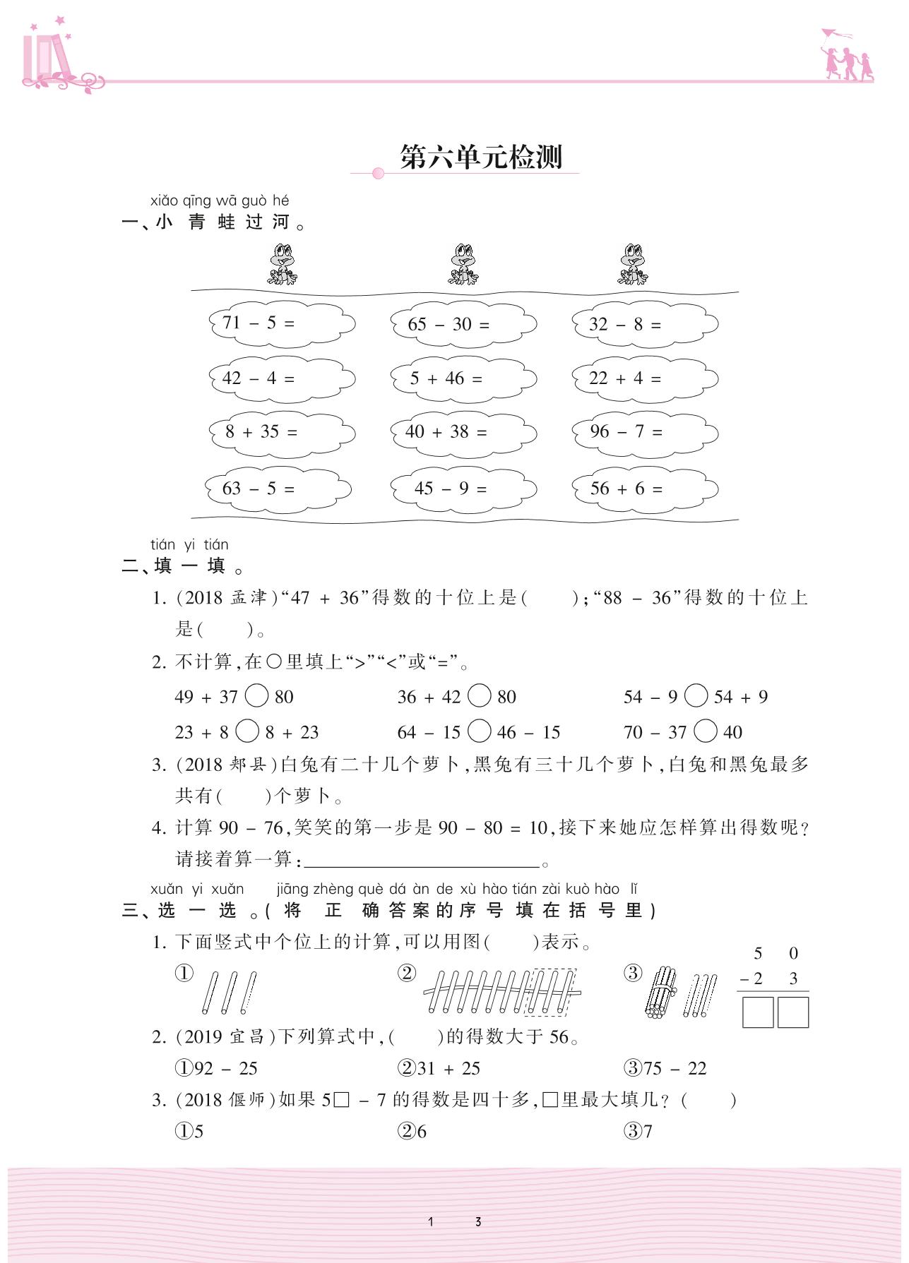 2021下册一年级数学苏教版 六 100以内的加法和减法(二)——第六单元检测
